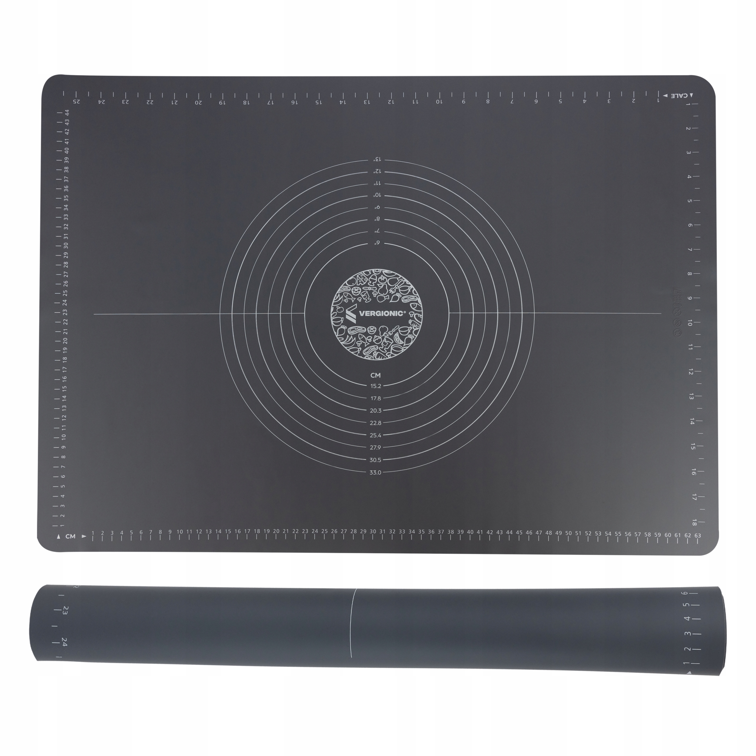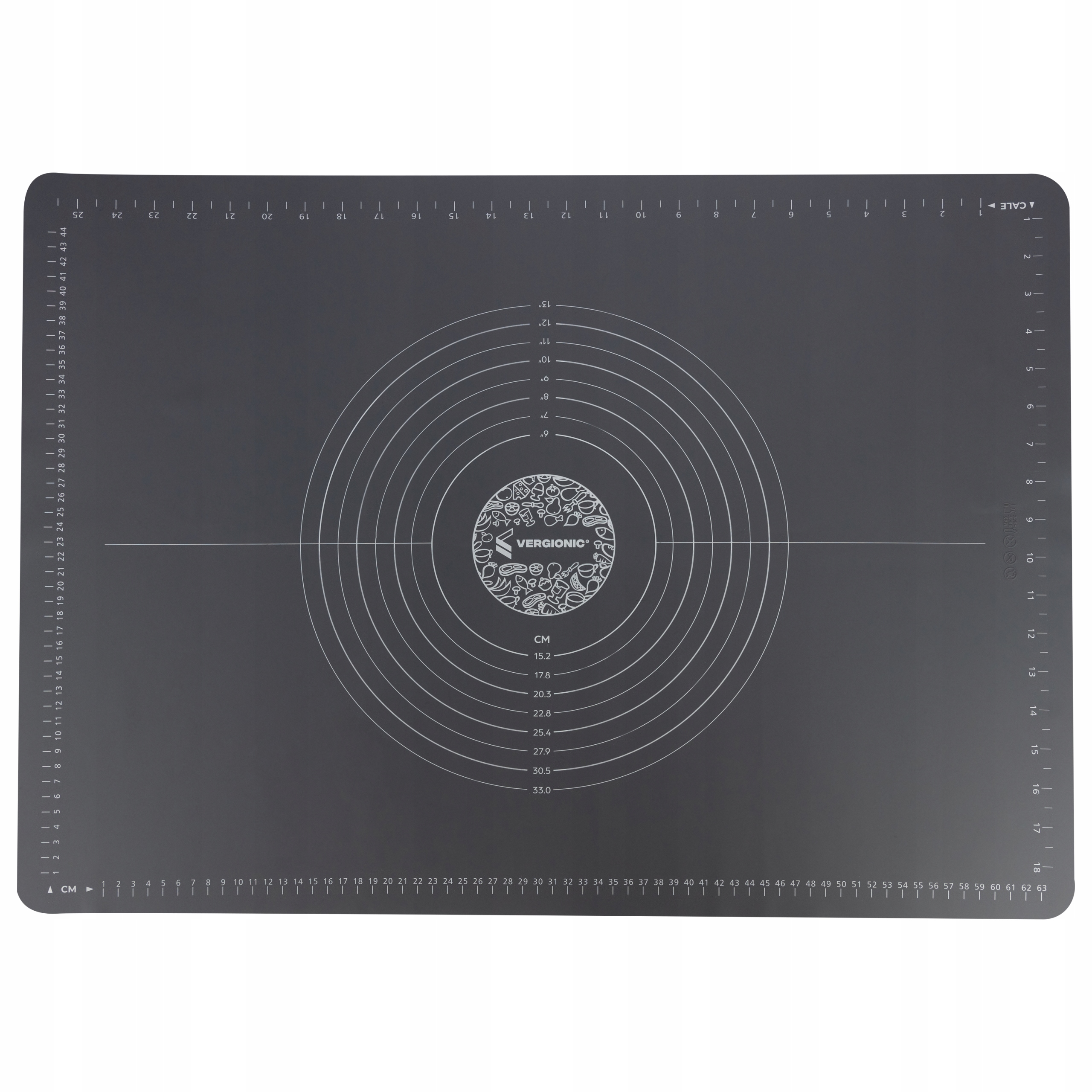 Коврик изготовлен из высококачественного силикона, который идеально прилегает к поверхности и доска не сдвигается. Гладкая поверхность коврика делает тесто не прилипающим. Подходит для мытья в посудомоечной машине. Размеры изделия 50 х 70 см. Доска для выпечки имеет специальные круглые формы, предназначенные для облегчения приготовления выпечки соответствующего размера, например, пиццы, диаметром от 15,2 см/6 дюймов до 33 см/13 дюймов. На доске имеются дополнительные мерные стаканчики. стороны - в дюймах и сантиметрах.