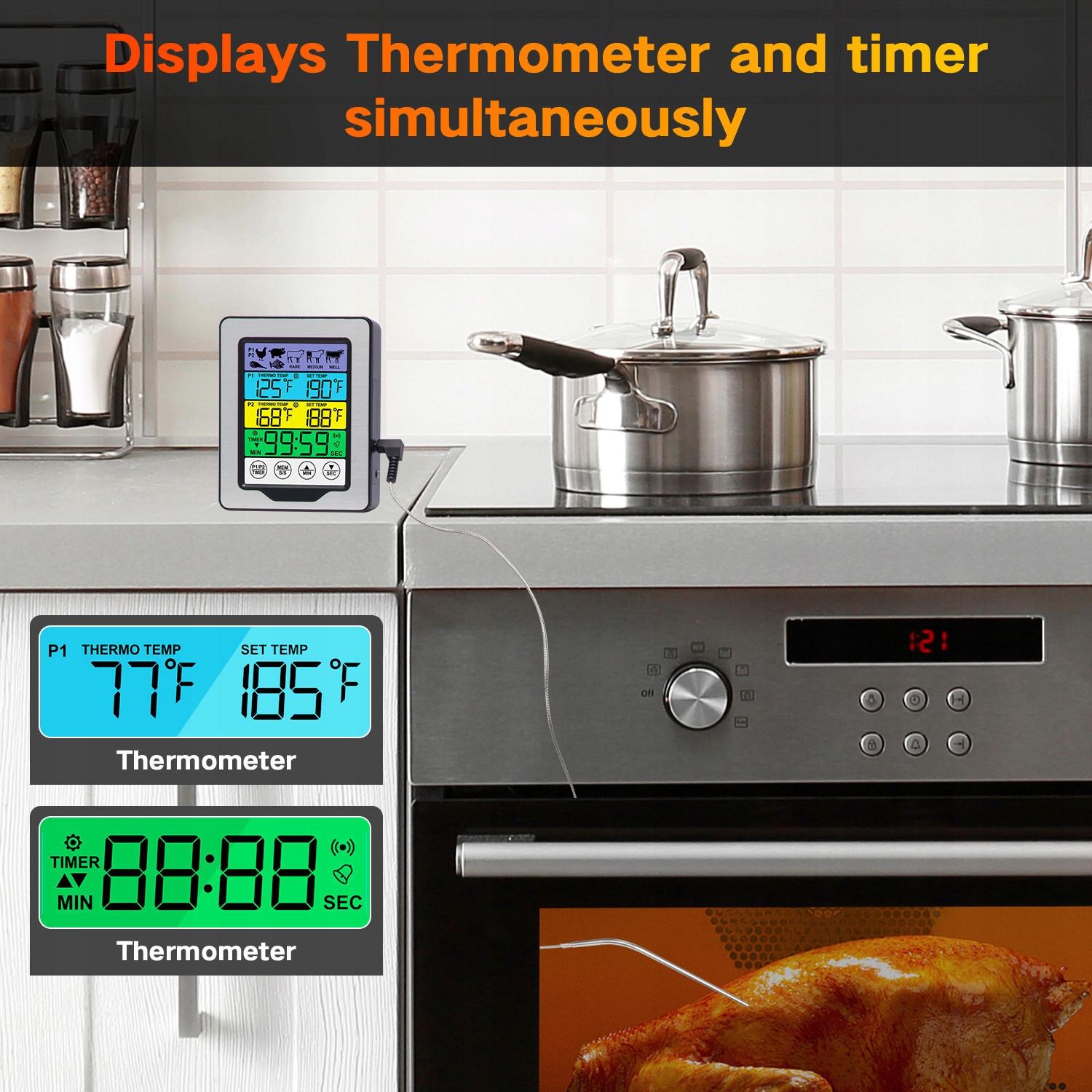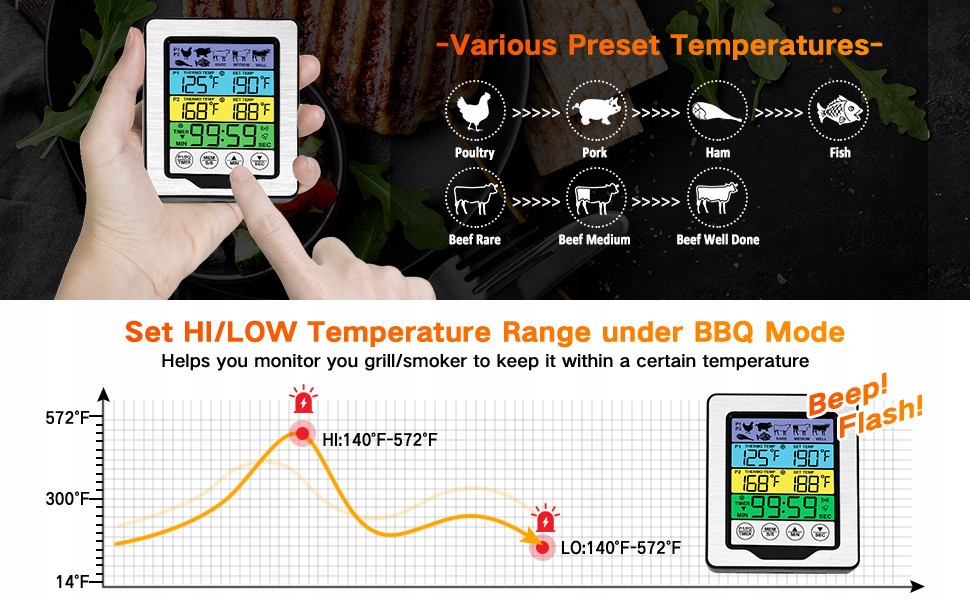 - 7 видов мяса на выбор, сигнализация высокой температуры, мигающая подсветка и звук. звуковой сигнал во время будильника;