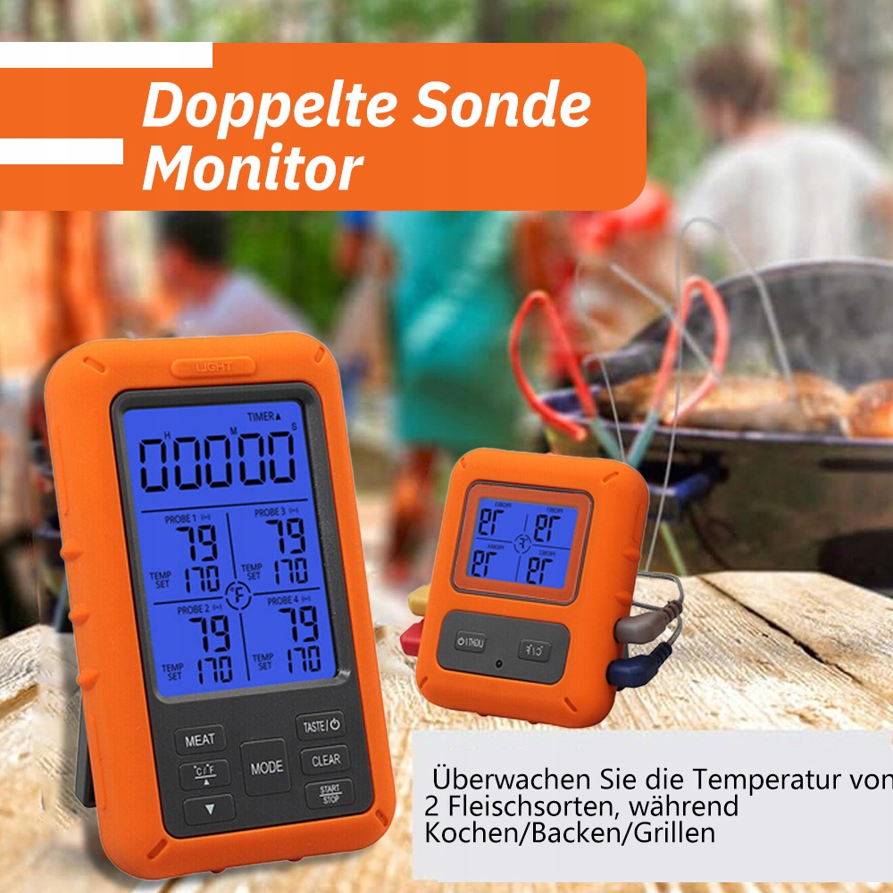 Цифровой ЖК -дисплей с подсветкой показывает точную температуру, чтобы выбрать ℃ или ℉, легко читать независимо от дня и ночи. Свинина, индейка, курица, рыба) и режим не -стандартного выбора. 5 типов уровня вкуса (хороший, средний, средний, средний редкий, редкий) на выбор. к апельсину. У него также есть время подсчета и таймер, удобный в использовании