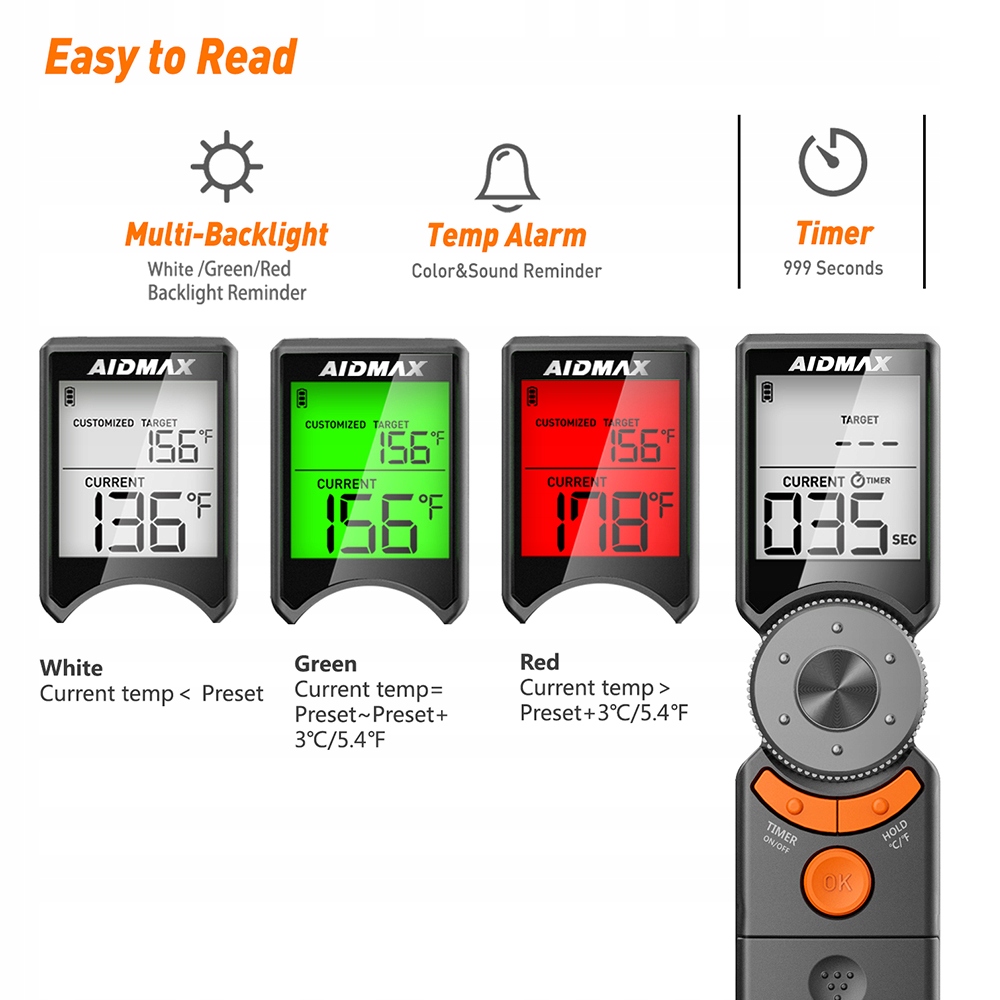 Aidmax Mini6 можно использовать при приготовлении множества различных блюд. , например, на гриле, в духовке, коптильне или во фритюре. В термометре предварительно запрограммированы температуры USDA: птица, говядина, баранина, свинина с различной степенью прожарки.