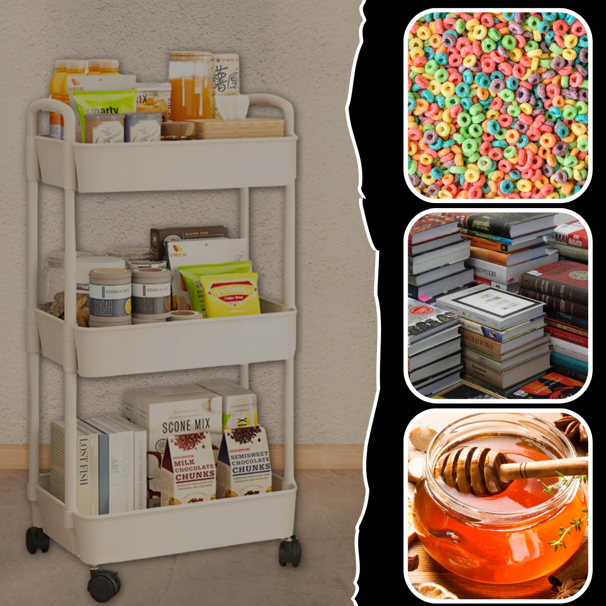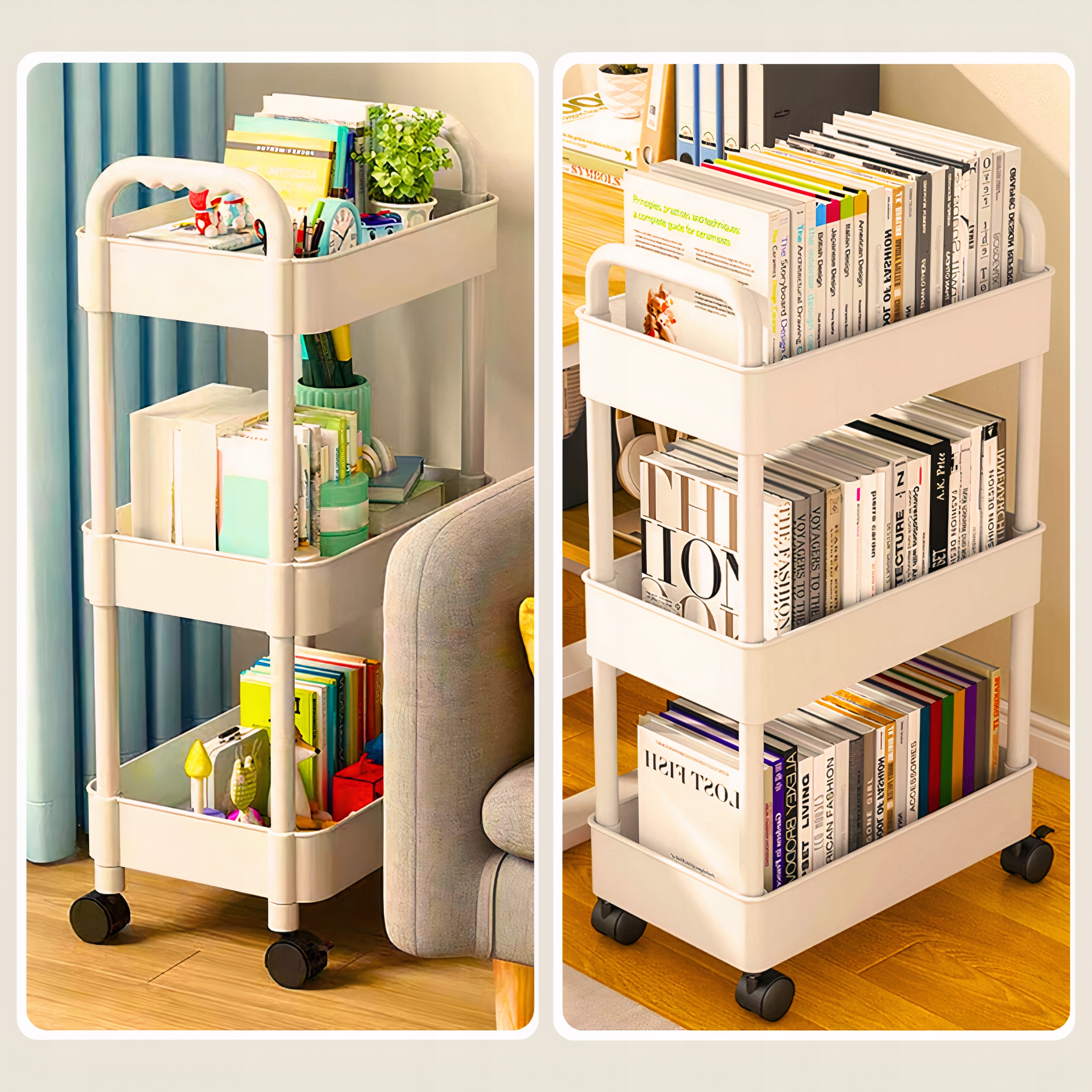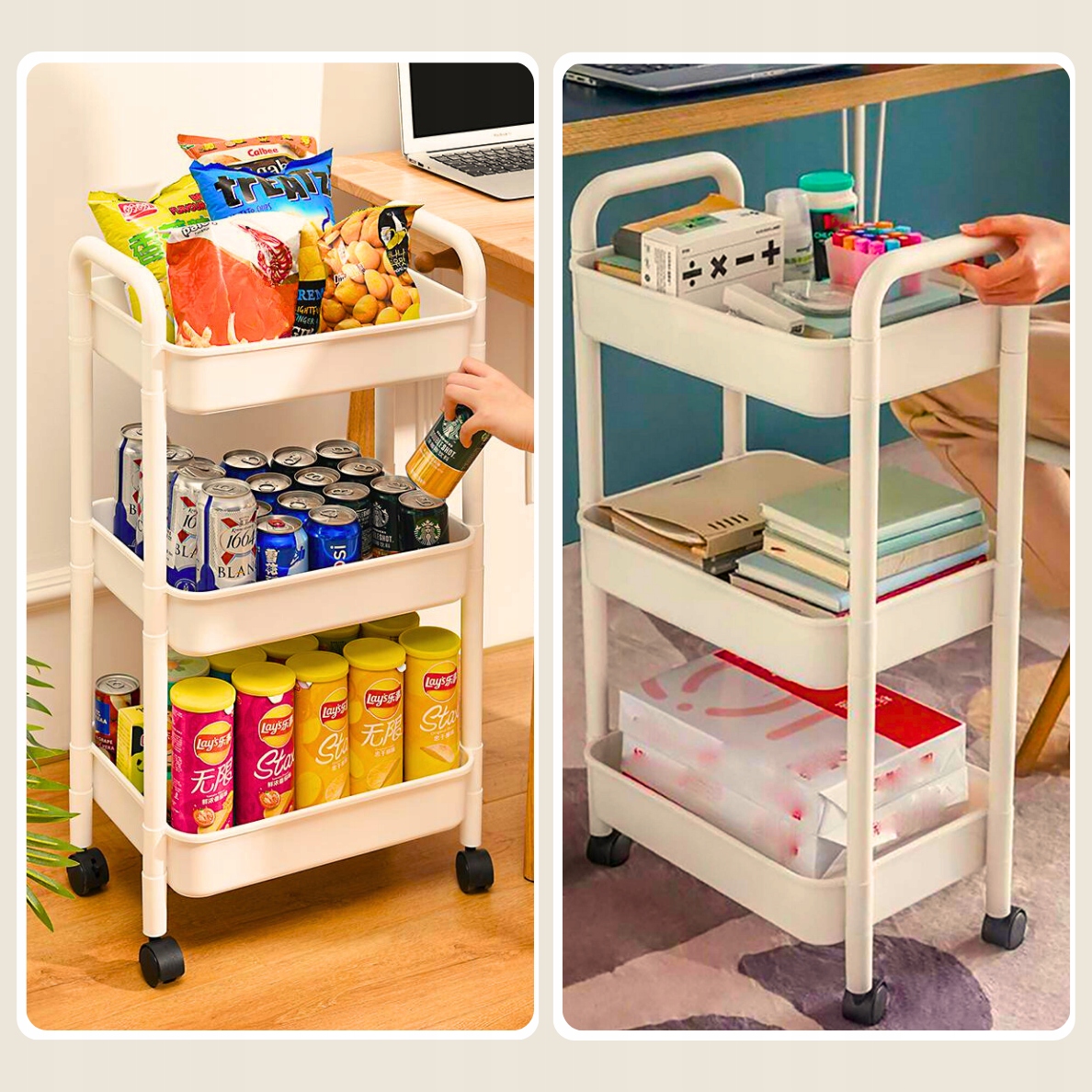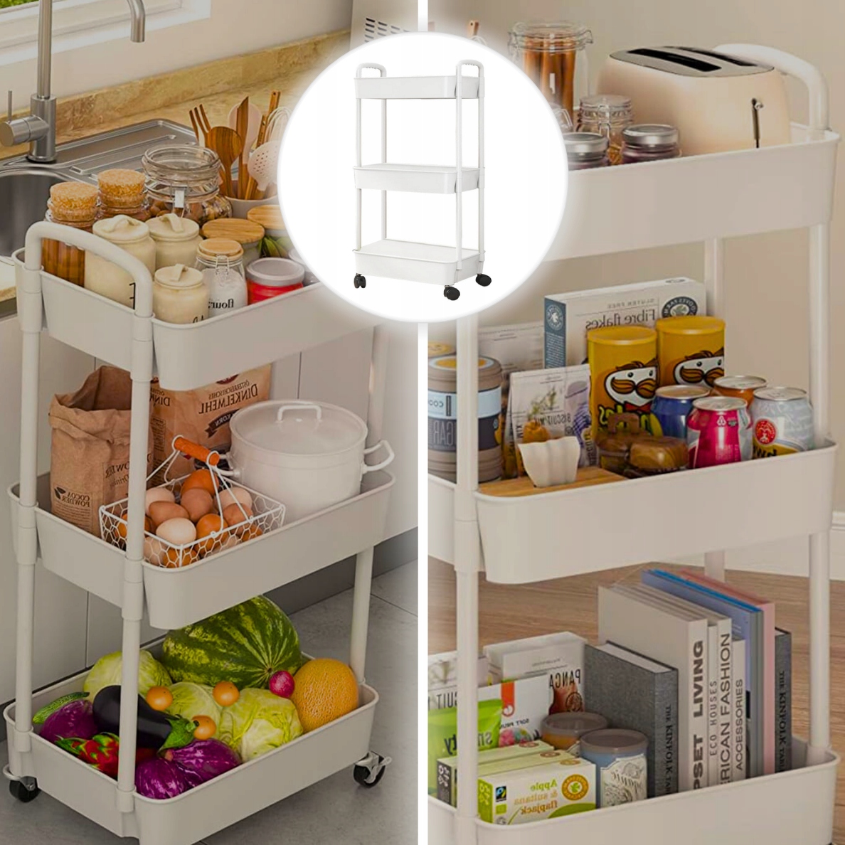Универсальная полка, идеально подходящая для различных помещений, таких как кухня, ванная комната, гостиная или спальня, позволяет использовать узкое пространство и облегчает доступ к необходимые предметы. Полка имеет три полки, на которых можно разместить множество различных аксессуаров, а также четыре колеса, два из которых фиксируются тормозом. В комплект также входят пять крючков, которые можно закрепить слева или справа на любом уровне.
