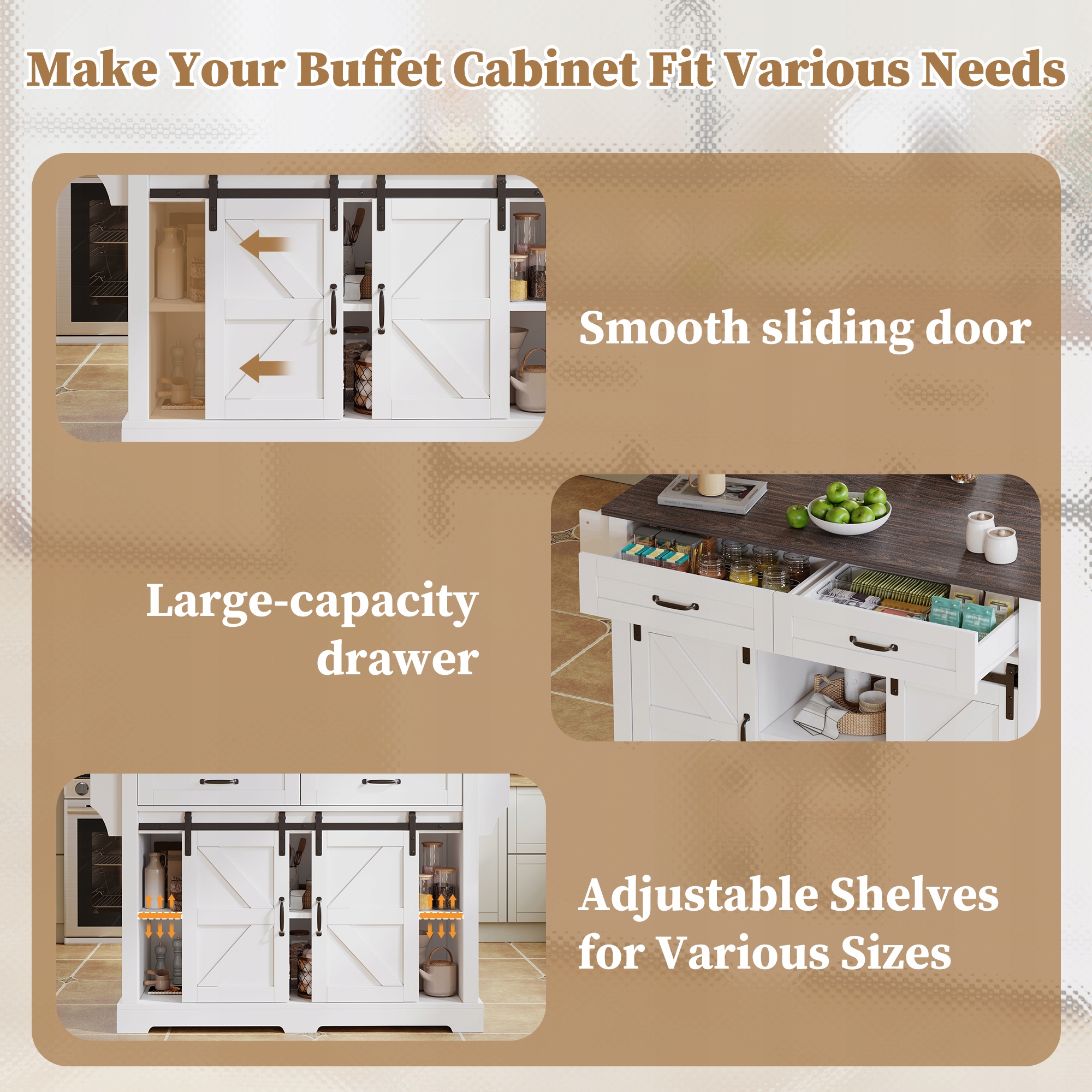 Практические размеры: Размер 120×45(70)×91 см имеет эргономичный дизайн. Изготовленная из высококачественного МДФ, конструкция сочетает в себе классический стиль амбара с функциональной эстетикой - идеально подходит для кухонь, столовых и гостиных.