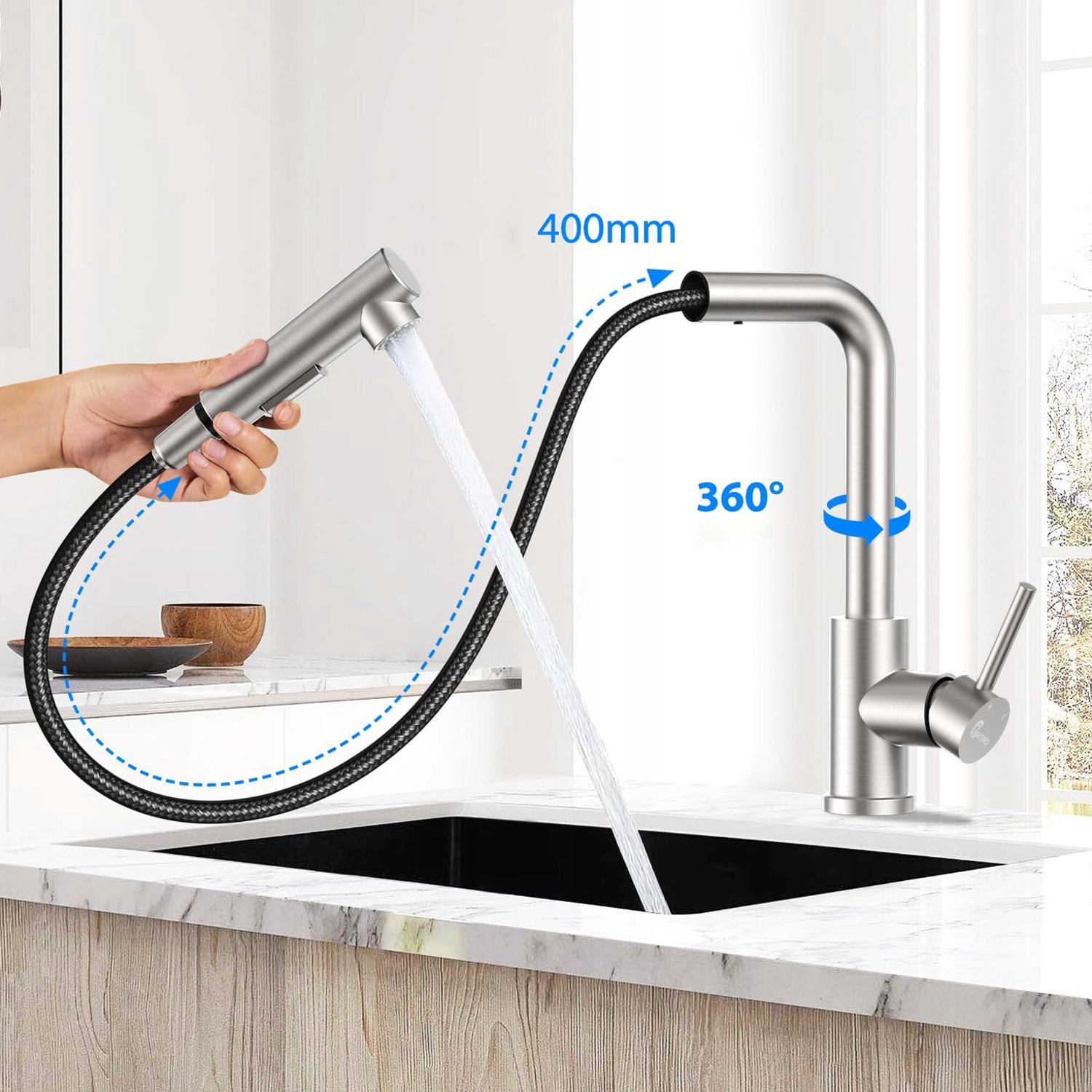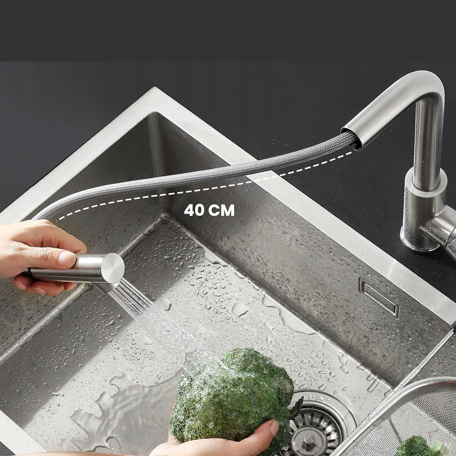 - Смесители для кухонного душа могут выдвигаться до 400 мм, что позволяет легко наполнять и мыть кастрюли и сковородки. раковина.