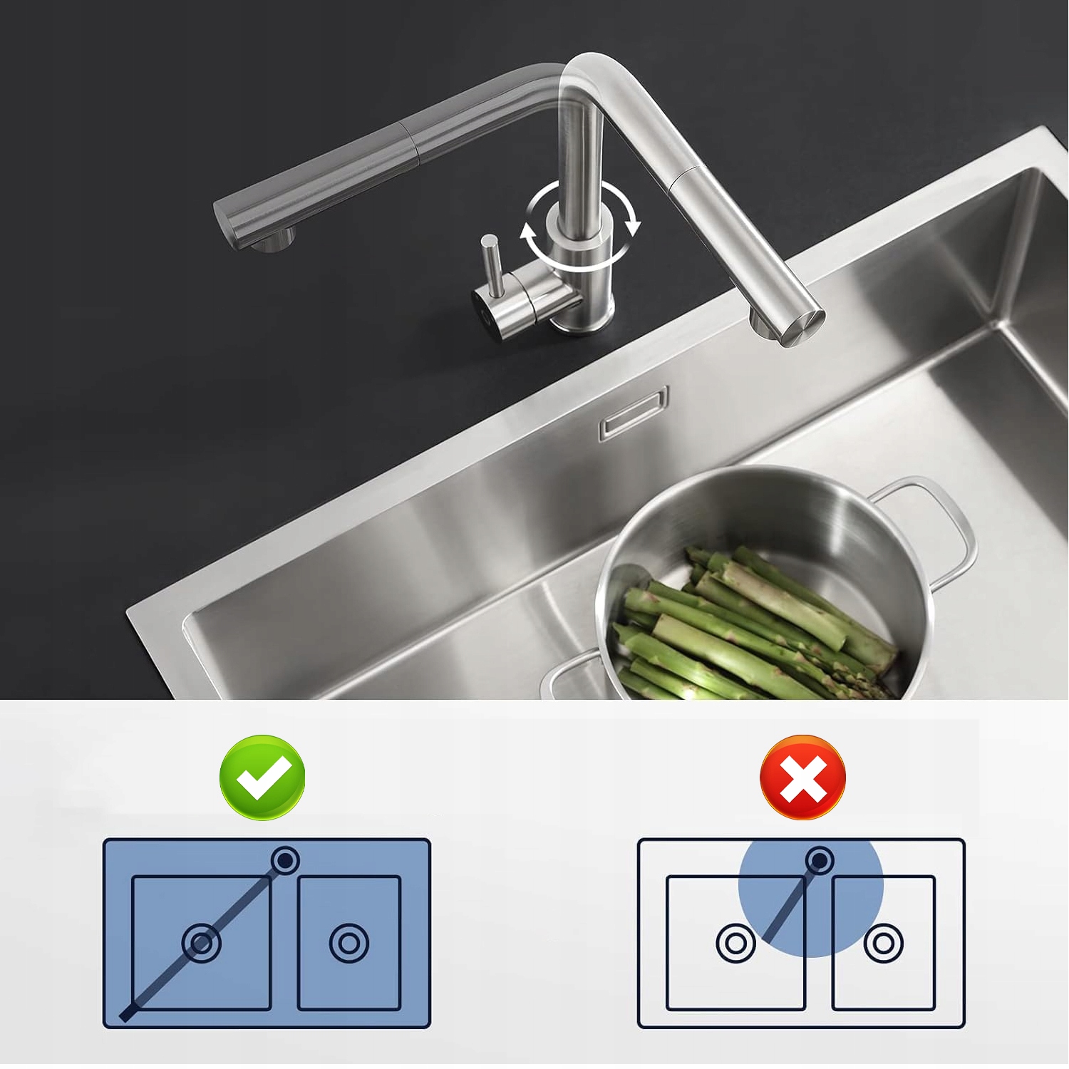 - Г-образный кухонный смеситель идеально помещается под навесным шкафом и может поворачиваться на 360°, что позволяет легко мыть большие сосуды.