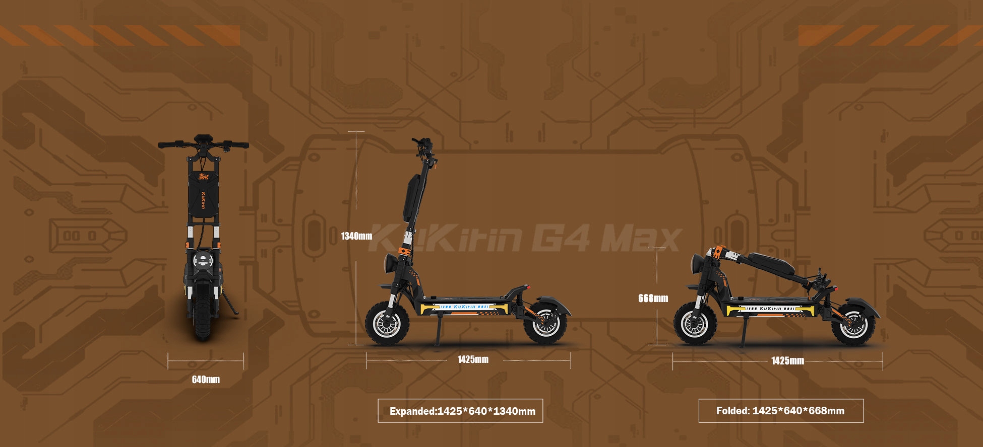 Kukirin G4 Max оснащен двигателями 60 В/ 1600 Вт*2, которые начинаются при крутящем моменте, чтобы помочь облегчить ускорение и преодоление холма. Благодаря скорости 86 км/ч можно достичь скорости вождения, что позволяет использовать возможность использования свободы на открытом воздухе, и это очень быстро и захватывающий электромобиль. Диапазон до 95 км . IP54 wood resistance