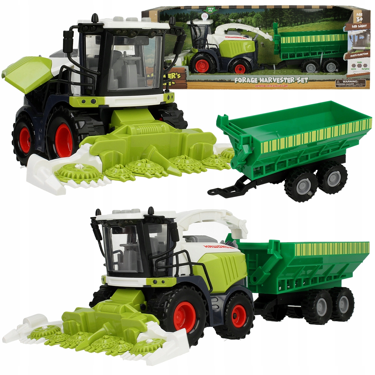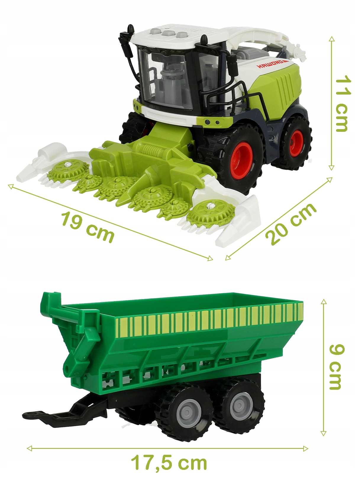 Игрушечный комбайн имитирует настоящую машину для уборки кукурузы. Комбайн позволяет развлечься, как в настоящем поле. Имеет жатку с подвижными шестернями и подвижную трубу для ссыпания сельскохозяйственных культур. Прицеп имеет специальный подающий шнек для складной трубы, по которой зерно засыпается на склад!
