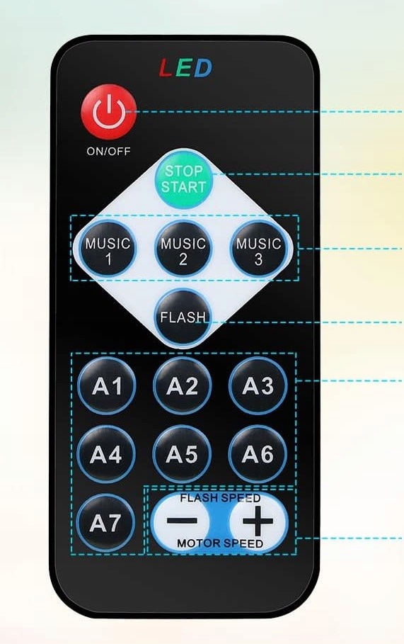 Все функции . Диско-шаром можно управлять с помощью пульта, входящего в комплект. Вы можете использовать его, чтобы изменить эффект освещения или, например, ускорить или замедлить вращение проектора. Особенно хорошо это будет работать, когда мы размещаем шарики в труднодоступном месте — например, на стене или потолке.