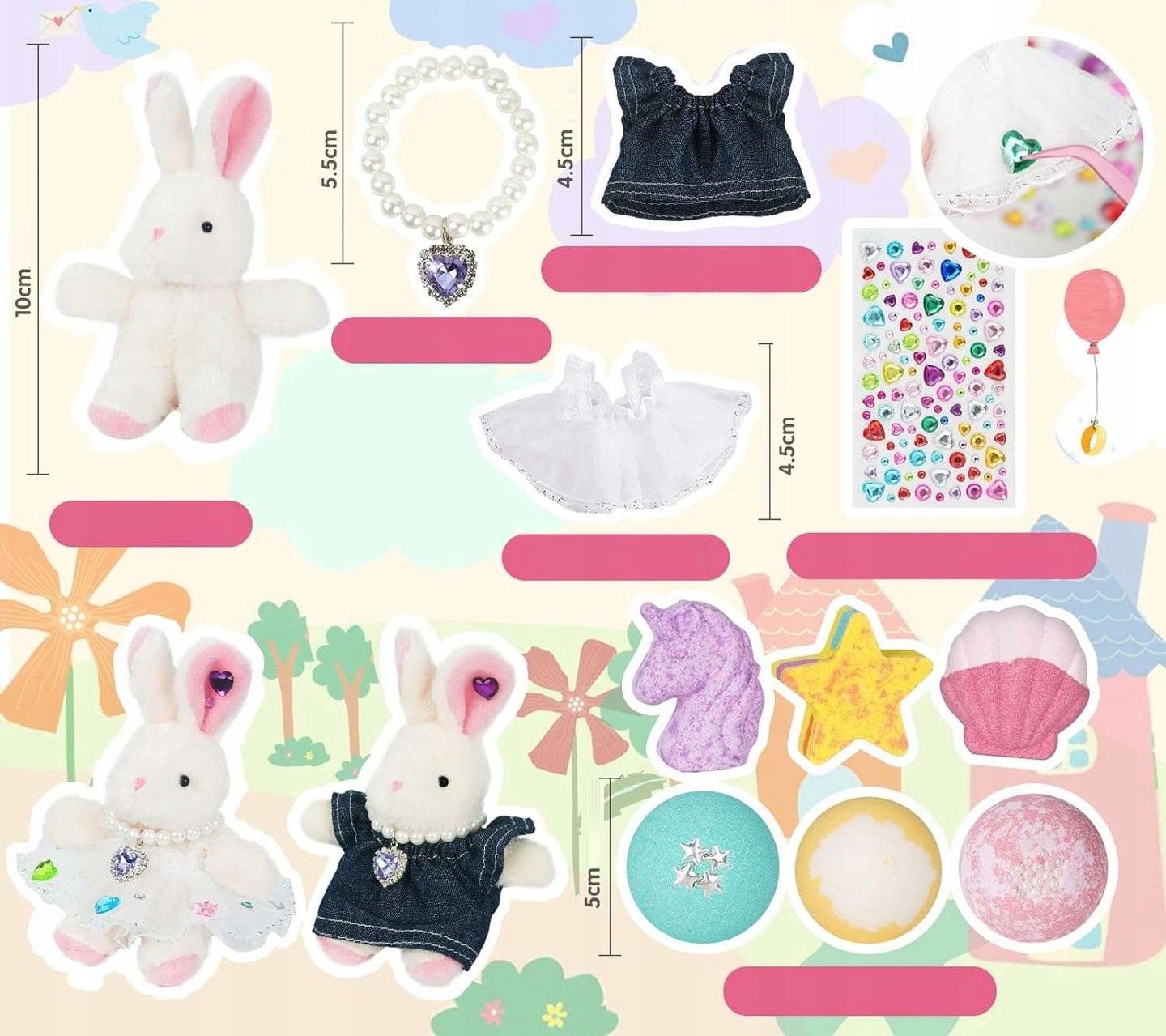 - Подарочный набор: он содержит 6 сверкающих пуль для ванны. Он также содержит куклу для кролика, наклейка с акриловым бриллиантом, два платья куклы и ожерелье