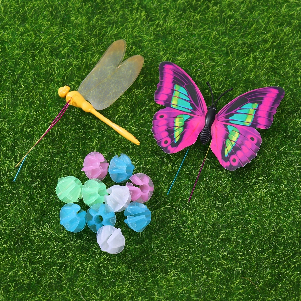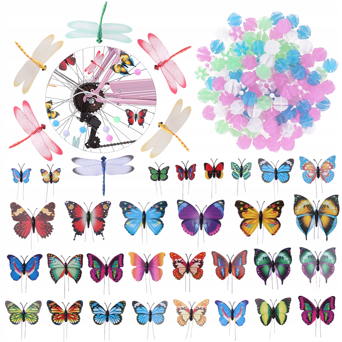 В комплект входит: 108 бусинок со спицами, как показано на рисунке, 30 зажимов-бабочек и 6 зажимов-стрекоз.