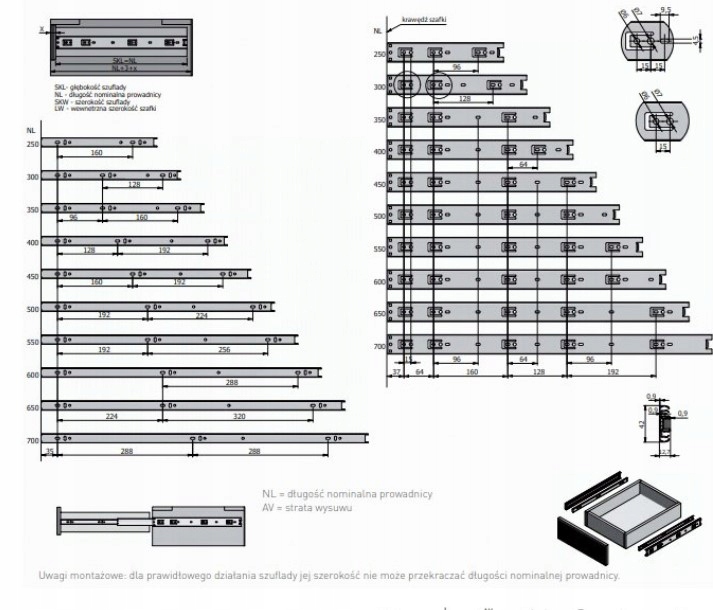 - Ширина ящика не должна превышают номинальную длину направляющей