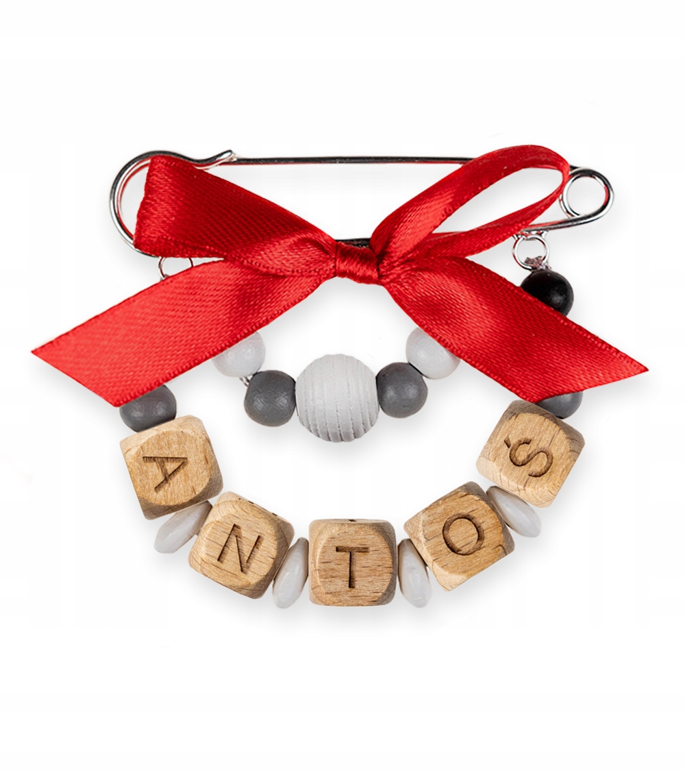 Именная деревянная подвеска с красным бантом – незаменимая вещь в каждой коляске. Брошь состоит из ярких деревянных элементов, которые красиво смотрятся в любой коляске, большой английской булавки из серебристого металла и декоративного красного банта.