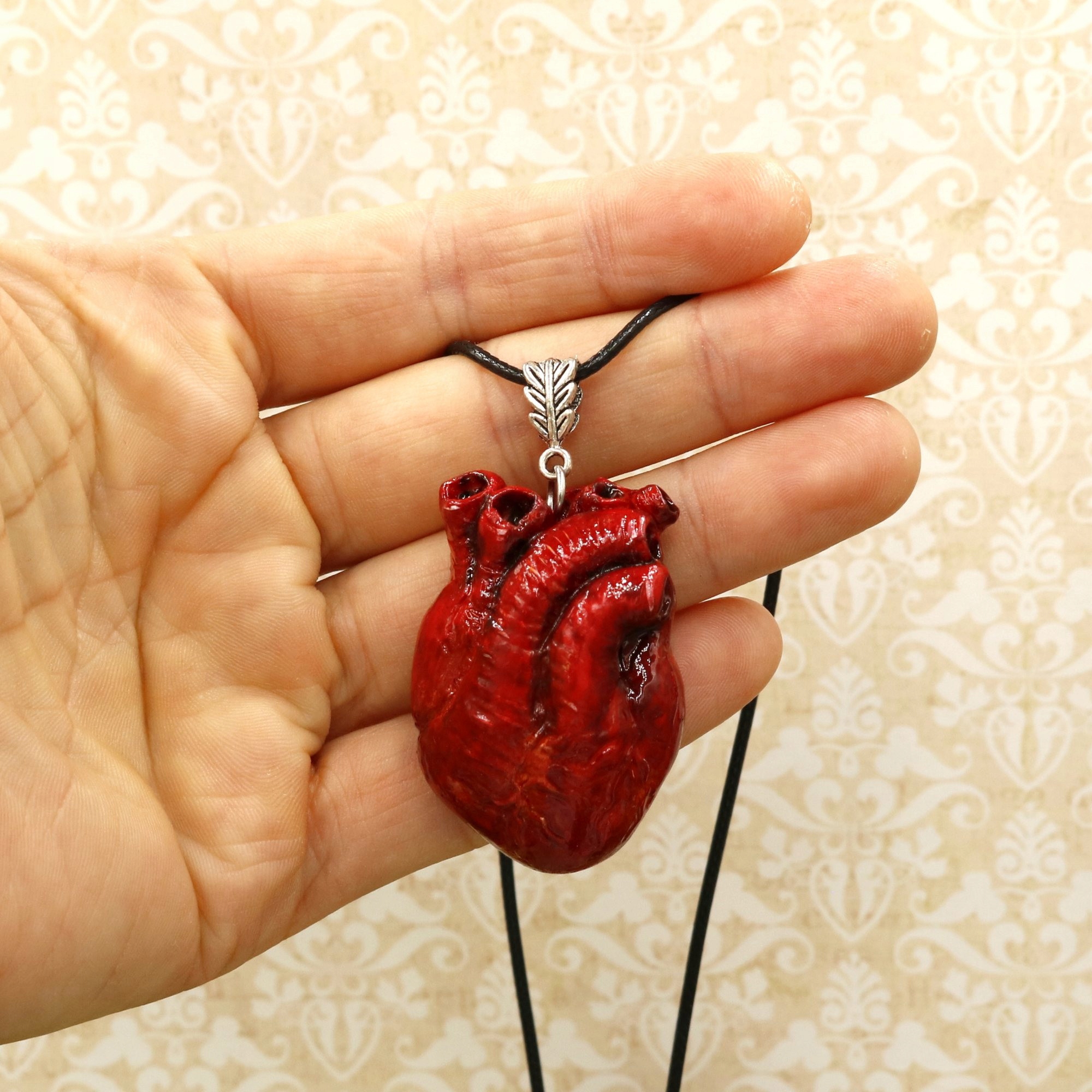 Колье с анатомической подвеской в форме сердца – предложение для тех, кто ищет оригинальное украшение. Каждый кулон, расписанный и вырезанный вручную из пластилина, уникален. Он подойдет как дополнение для людей, которым нравится мрачный готический стиль, или как забавный подарок на День святого Валентина для вашего «сердца». В качестве дополнения к косплей-костюму или в подарок людям, интересующимся медициной, или просто любителям уникальных и необычных украшений.
