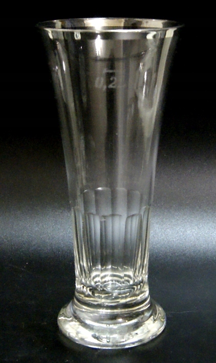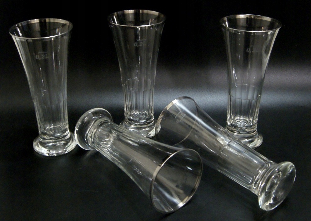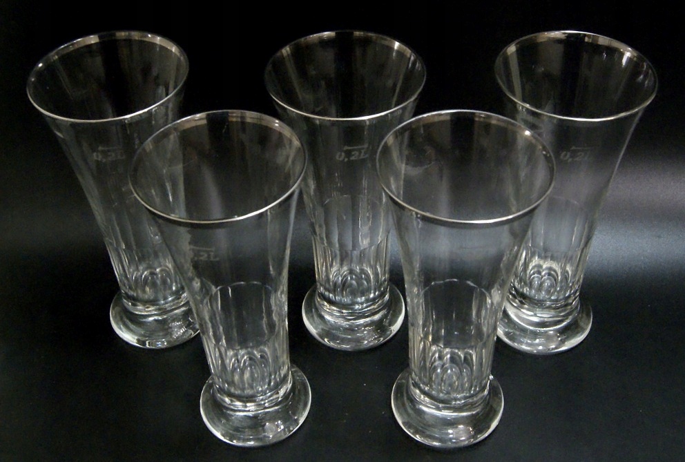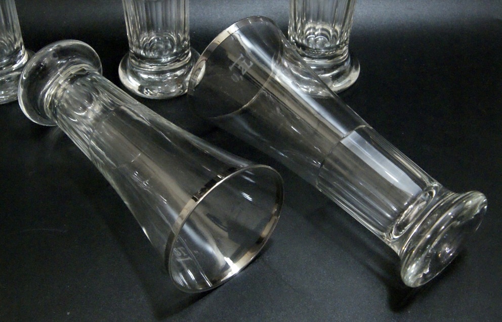 Красивые старинные бокалы - набор из 5 бокалов, изготовлены из бесцветного хрустального стекла, посеребренная оправа, имеются незначительные потертости по серебрению. Старое стекло, содержит пузырьки воздуха. На мерном стакане указано 200 мл.