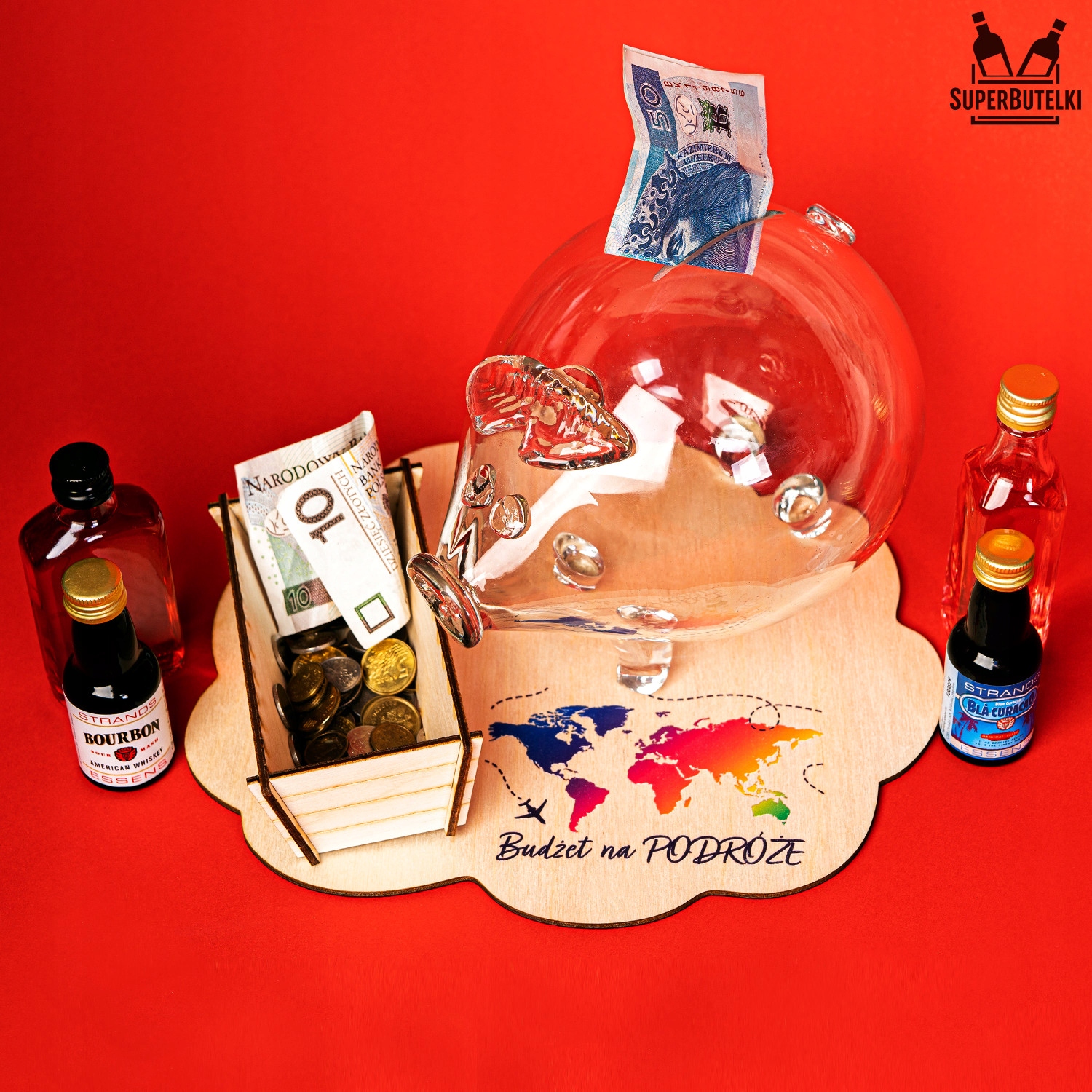 Копилка-копилка ГЛАДКАЯ в комплекте с корытом и деревянной подставкой с принтом.