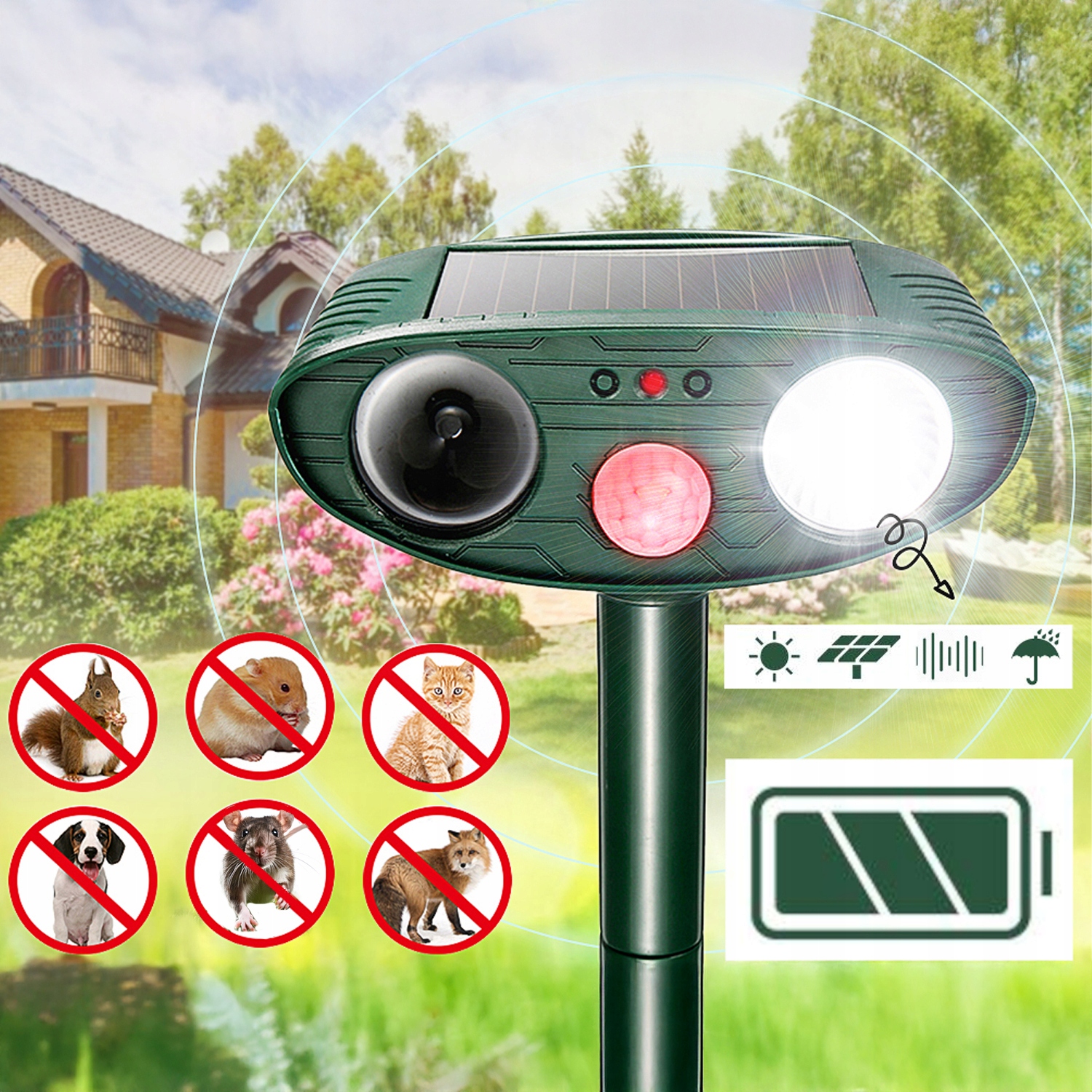 Последний репеллер солнечных животных имеет ряд операций до 75m2 b>. Животный репеллер издает высокие звуковые волны, которые чрезвычайно неприятны для животных, таких как собаки, кошки, лисы, крысы и многое другое.