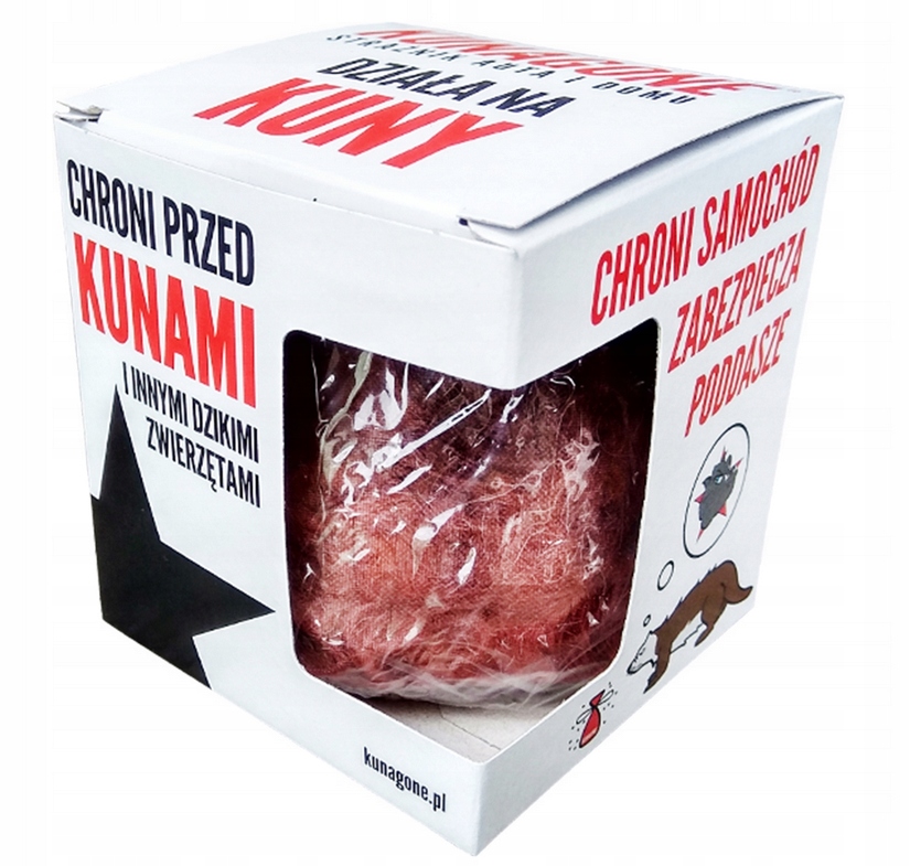феноменальный польский продукт , который фактически мешает мартенсам от поиска электрической установки автомобиля, и делает его раздраженным и останавливает кормление мартенс на чердаках и на своих местах. Продукт запускает естественный запах собаки, которая является естественным врагом Куна, благодаря которого он пугает не только мартен, но и других диких животных. Аромат практически незаметный для людей