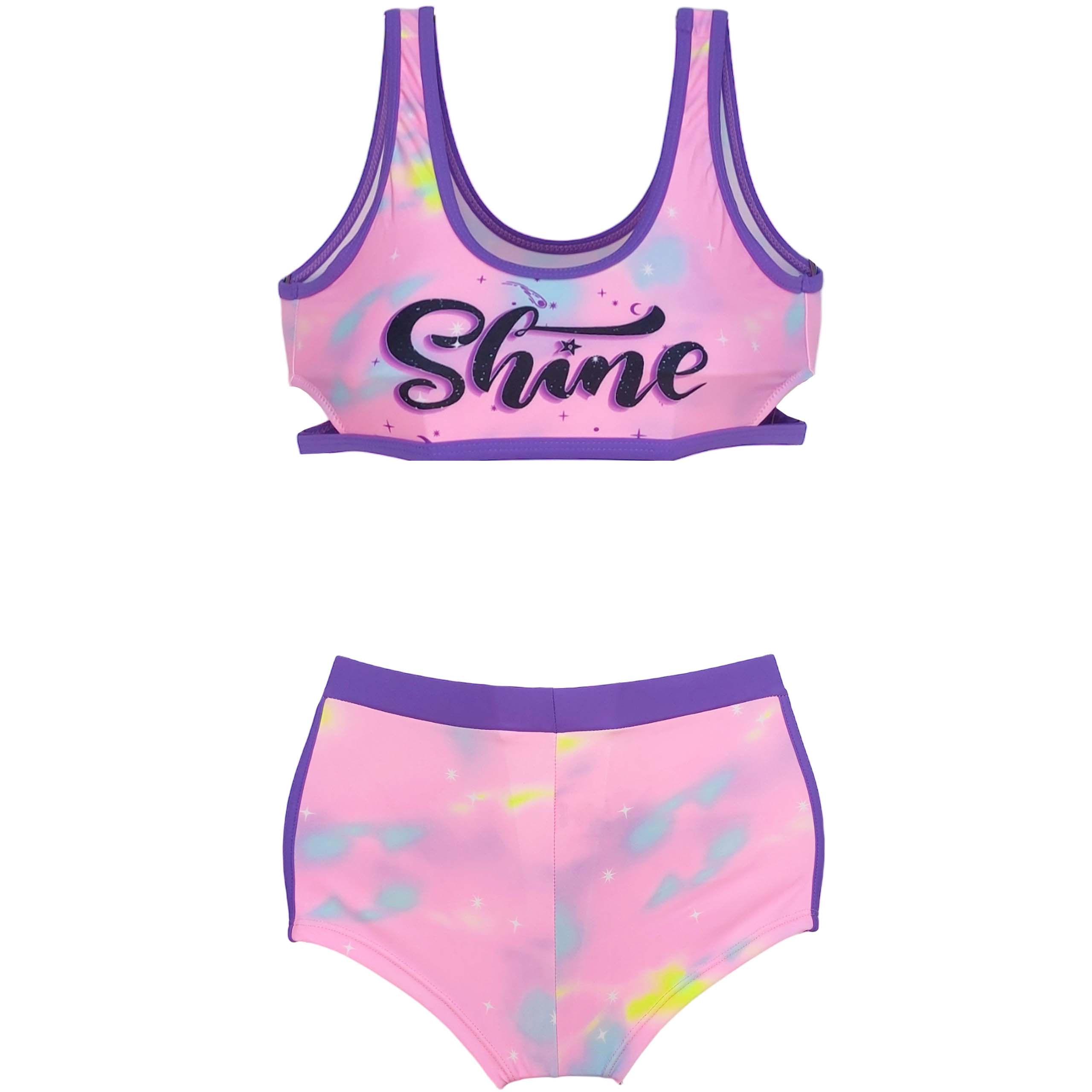 Купальник омбре в красивых пастельных тонах. Бюстгальтер на широких бретелях, украшенный надписью. Дополнительный комфорт обеспечит форма трусиков, выполненная в виде шорт. Идеальный наряд для детей, которые любят активно проводить время во время каникул. Фиолетовая отделка на трусиках и бюстгальтере. В бюстгальтере есть вставки, которые можно снять. Костюм очень хорошего качества, спереди имеется подкладка.