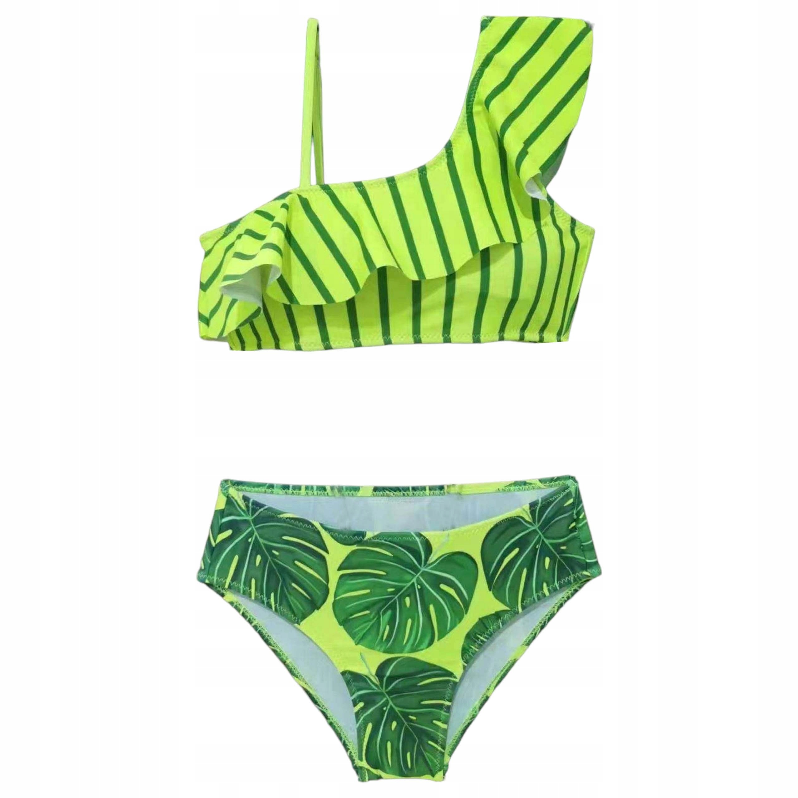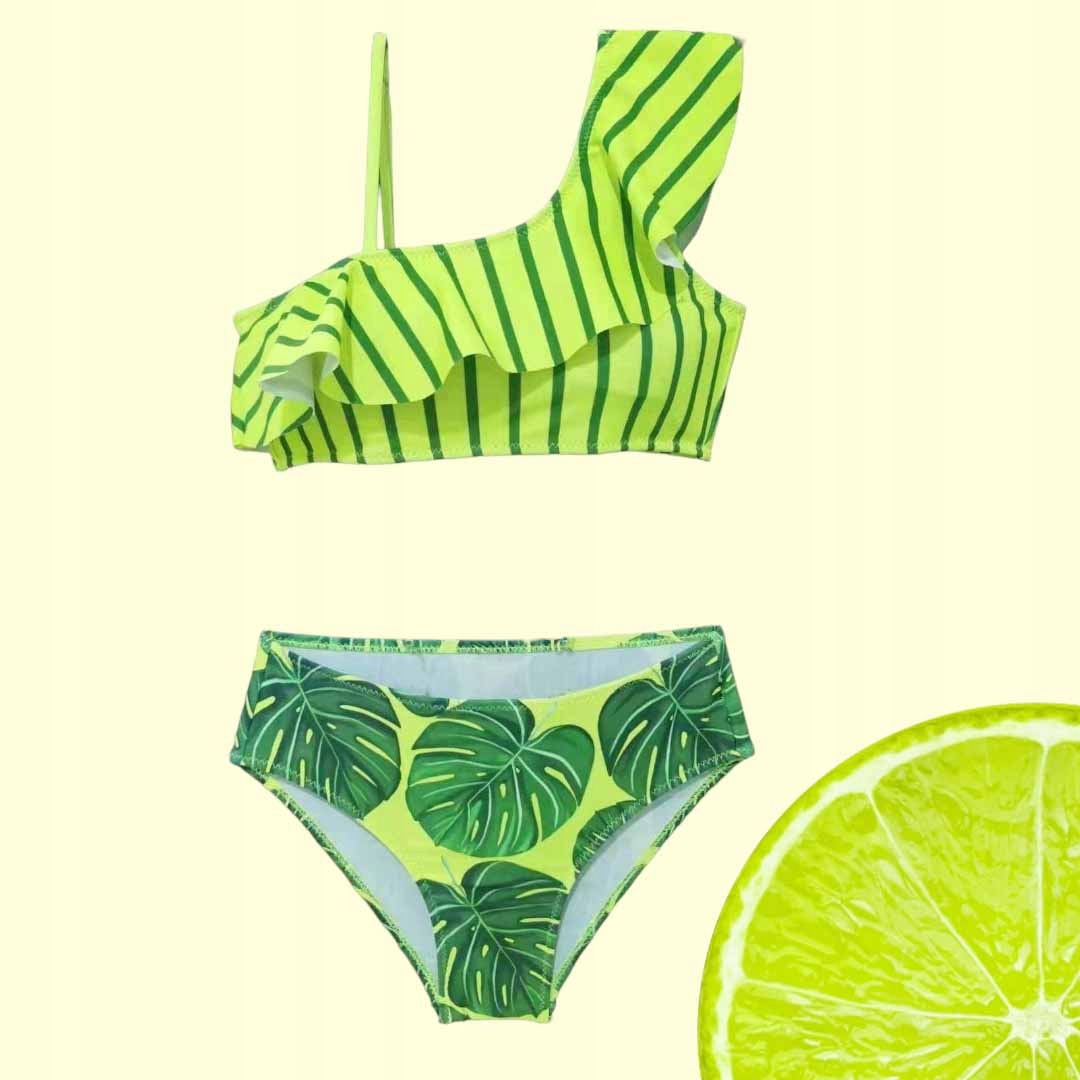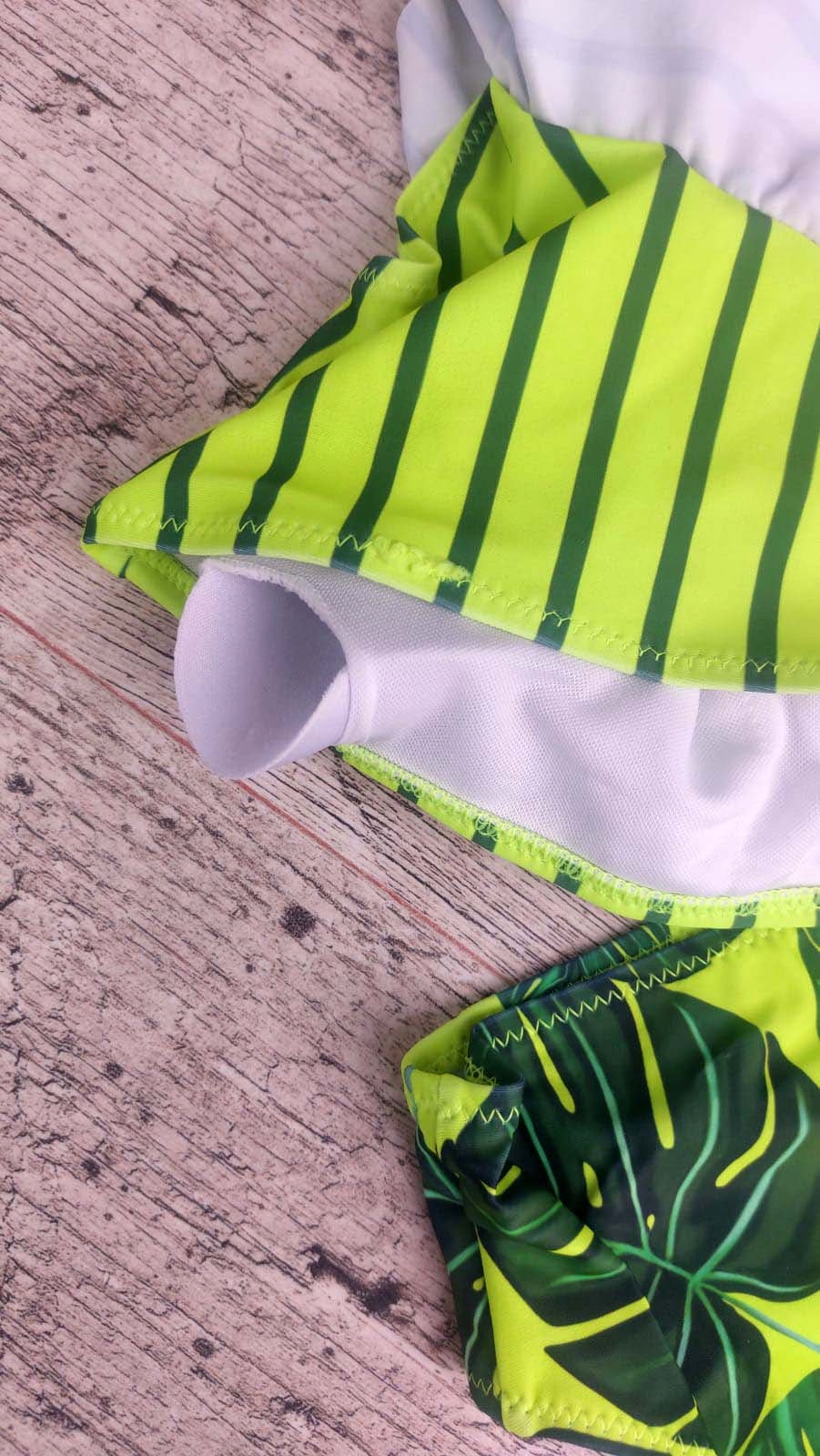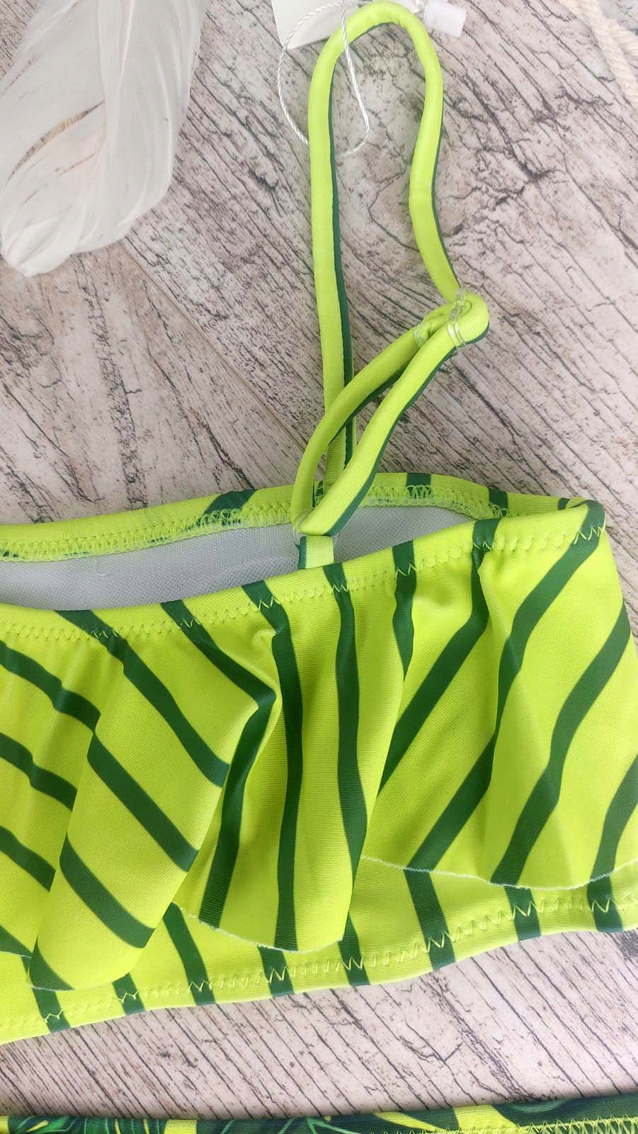 Костюм в красивой неоновой расцветке.Бюстгальтер в полоску, украшенный очаровательной рюшей на одном плече, на другом - тонким регулируемым бретелем. В бюстгальтере есть вставки, которые можно снять. Трусики с высокой посадкой и узором из модных и оригинальных листьев.