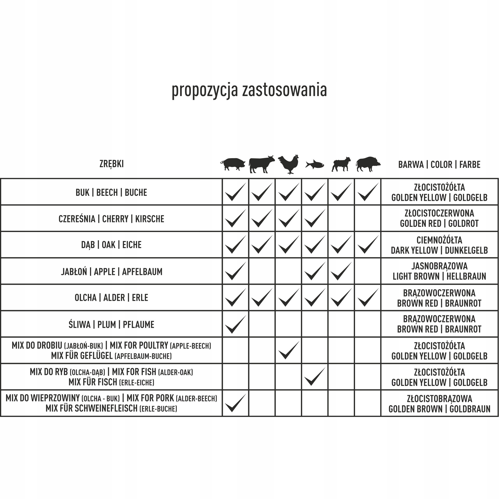 - обеспечивает отличный аромат, вкус и внешний вид приготовленной птицы, говядины, свинины, ягненка, оленины и ходьбы и рвени - благодаря их размеру (8-12 мм), эти чипсы особенно рекомендуются для такого назора на балконе -коптильнике и переносных моделях, потому что они создают дым для долгого времени и равномерно. Они также будут работать в дымовых генераторах для более крупной коптильской дома.