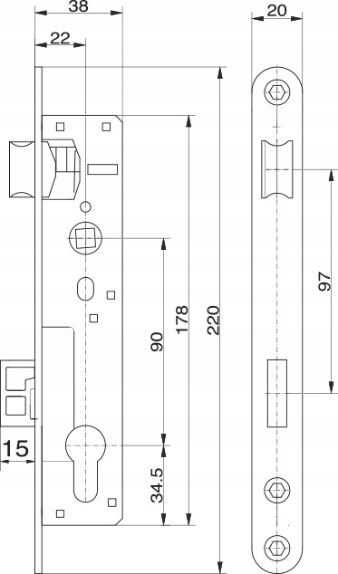 Замок накладной и ригель 90/22 мм – для стойки 40х40 мм Врезная защелка и ригельный замок с рычагом, предназначенный для дверей и ворот. Замок универсальный – его можно устанавливать на правые и левые двери. Защелку можно переместить, не разбирая замок, открутив его головку.