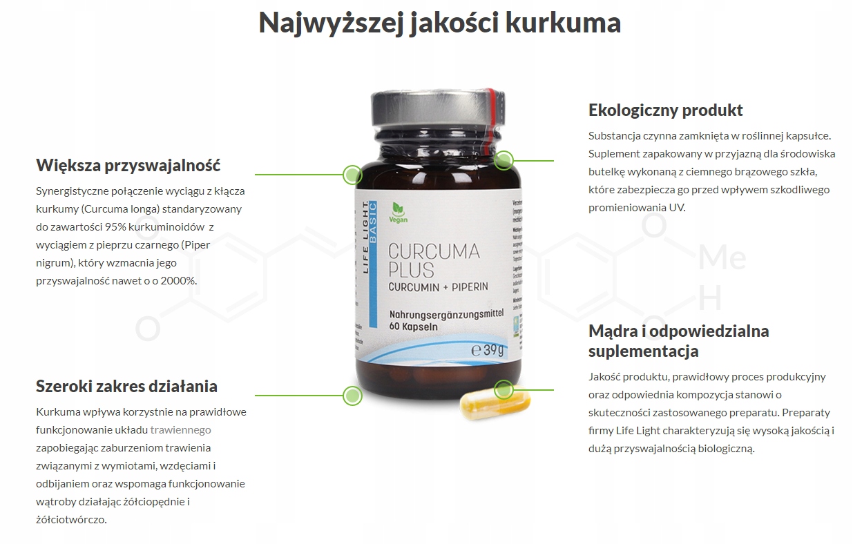 - Высочайшее качество синергетической комбинации экстракта корневища куркумы (Curcuma longa), стандартизированного до 95% куркуминоидов, с экстрактом черного перца (Piper nigrum), который усиливает его биодоступность до 2000%.