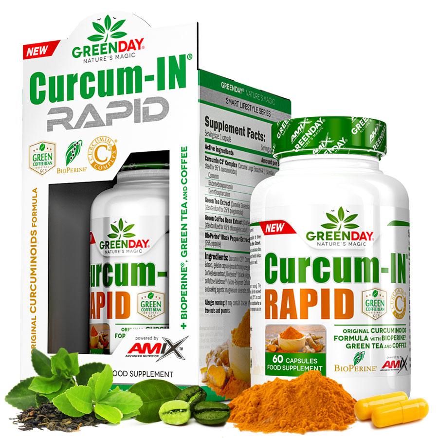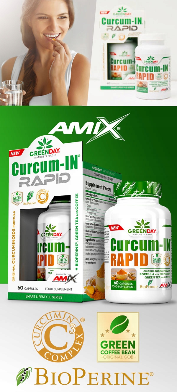 Таблетки куркумина с добавлением пиперина, зеленого чая и зеленого кофе от Amix GreenDay Curcumin Radpid.