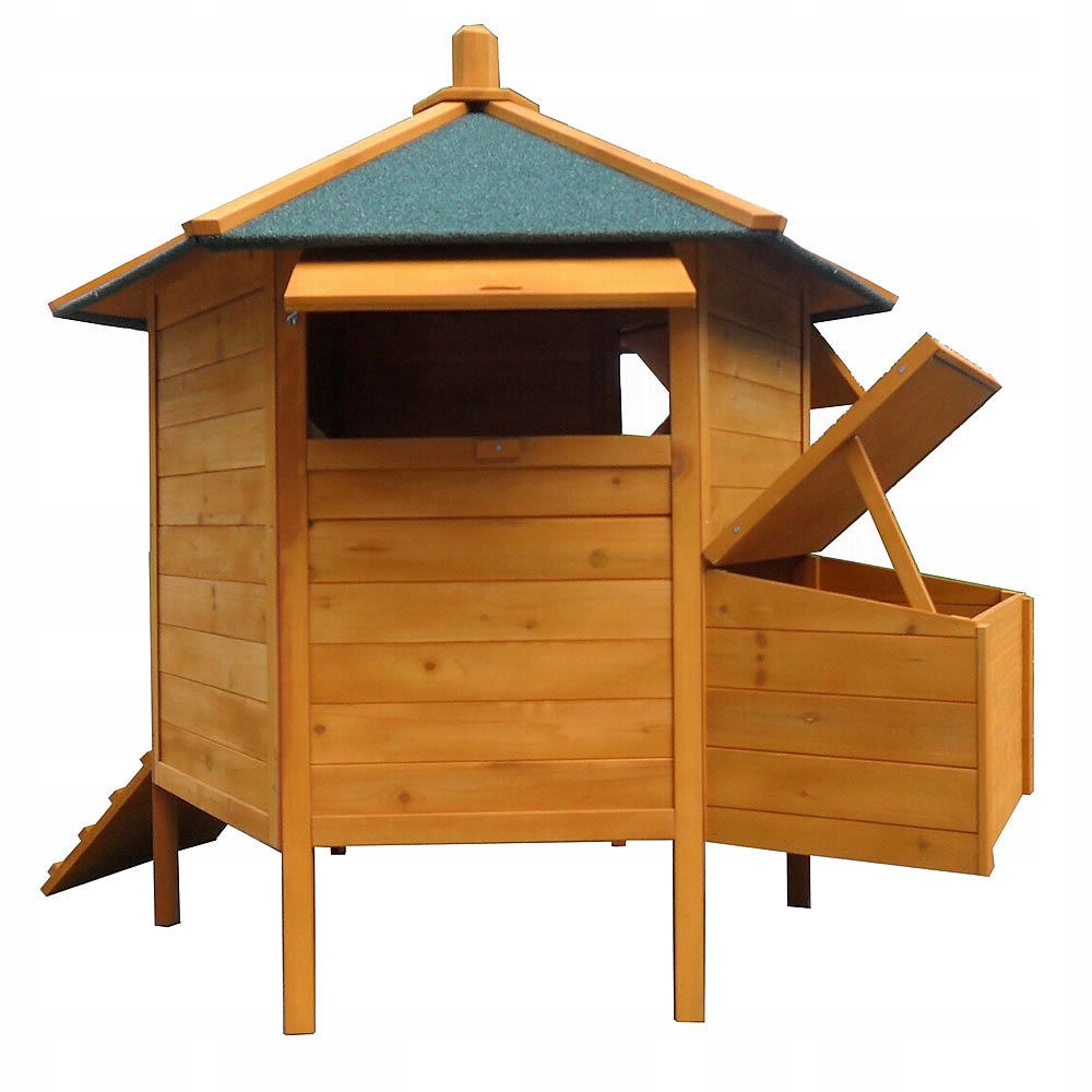 Стильный и, прежде всего, логично спроектированный курятник обеспечивает курам высочайший стандарт, комфорт и достаточную свободу передвижения. Ящик крепится сбоку и открывается вверх, поэтому вы можете без проблем брать свежие яйца. Благодаря отделению скворечников от остальной части курятника яйца остаются чистыми, и куры могут насиживать их в тишине и покое. В передней части курятника имеется закрытый вход и пандус. Благодаря тому, что курятник стоит на ножках, он находится над землей, что защищает кур от холода и влаги. Устойчивая деревянная конструкция крыши является водонепроницаемым покрытием курятника, а также обеспечивает защиту от града и снега.