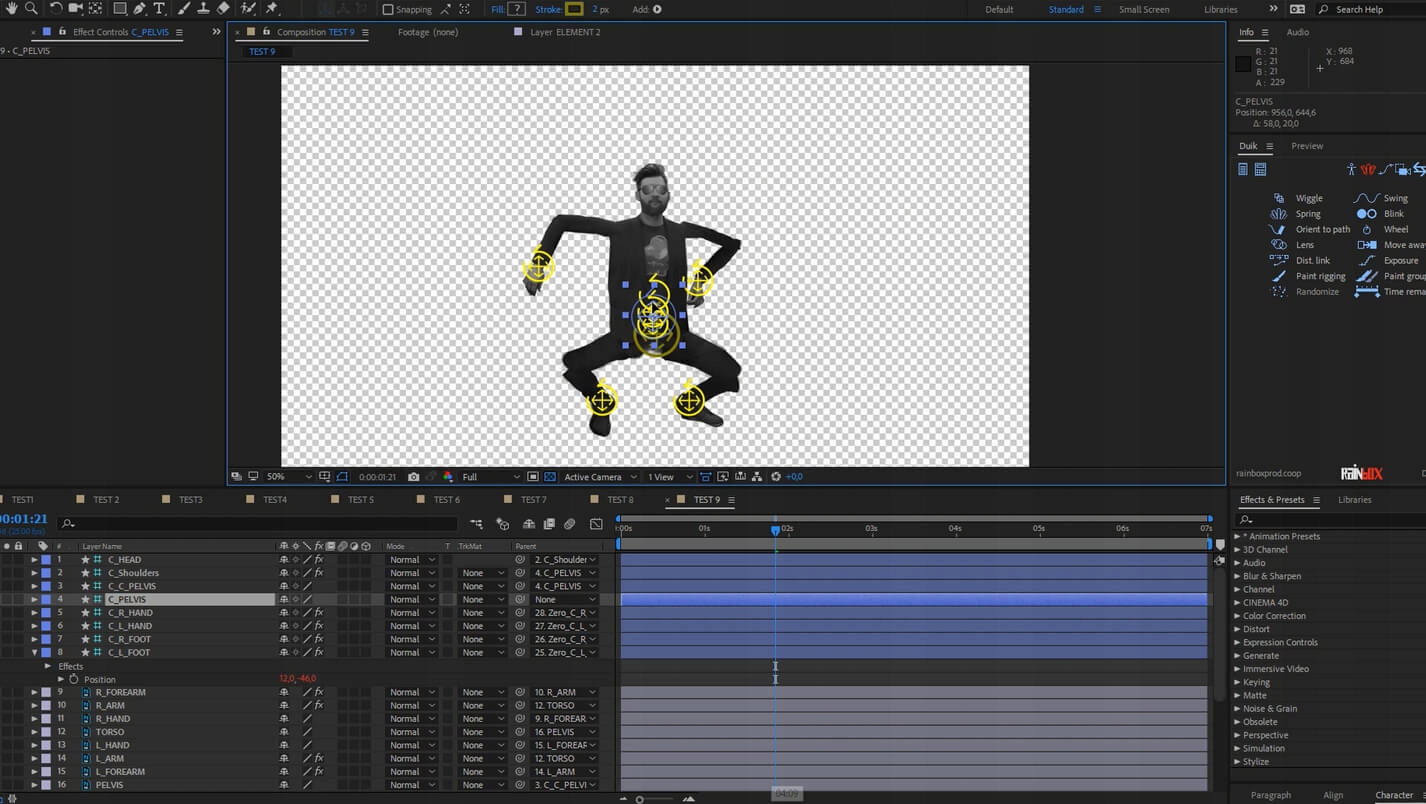Следующий этап — импорт векторного персонажа, созданного в Illustrator. Затем с помощью After и плагина Duik вы выполните риггинг, т.е. добавите точки изгиба, благодаря чему анимация персонажа приобретет человеческие движения. Благодаря контрольным точкам персонаж сможет двигать руками, ногами и ступнями. Кроме того, вы импортируете фотографию и научитесь создавать опорные точки на руке человека. Вы узнаете о системе игральных костей, используя опцию марионетки.