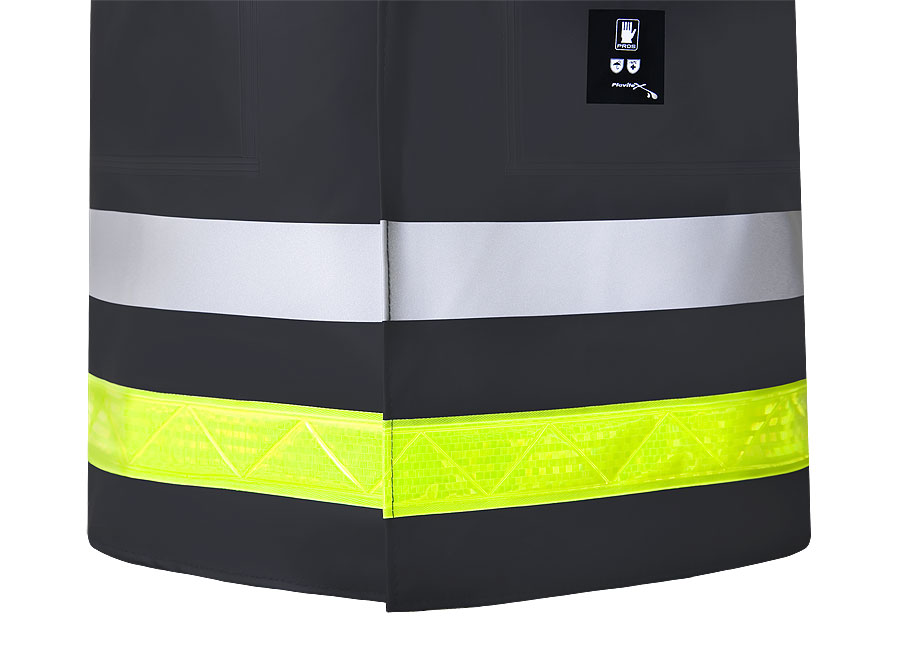 Куртка из ткани Плавитекс, флагманского продукта бренда PROS. Разумеется, как и положено PROS, изделие полностью водонепроницаемо даже после длительного использования. Благодаря надписи и светоотражающим лентам изделие предназначено для пожарных. Продукт не защищает от огня, он защищает только от воды и делает это очень хорошо.
