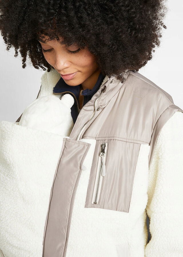 На молнии, без капюшона. Два кармана по бокам, молнии в боковых швах, позволяющие расширить пальто. Пальто, которое можно носить во время беременности и после родов. Материал похож на баранину. У куртки отстегивающиеся рукава, поэтому ее можно носить как жилет.