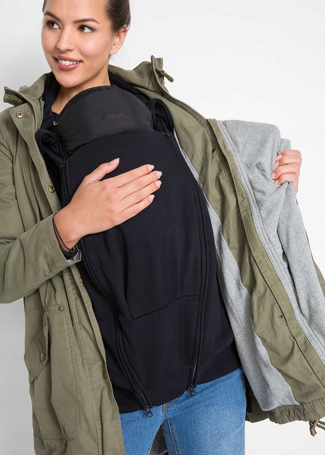 закреплен с застежкой и нажатием без капюшона с ремнями. Два кармана по бокам, по боковым швам, молнии, позволяющие расширить слой. Куртка для ношения во время беременности и после родов. На серой хлопковой подкладок, переходная, пружина.