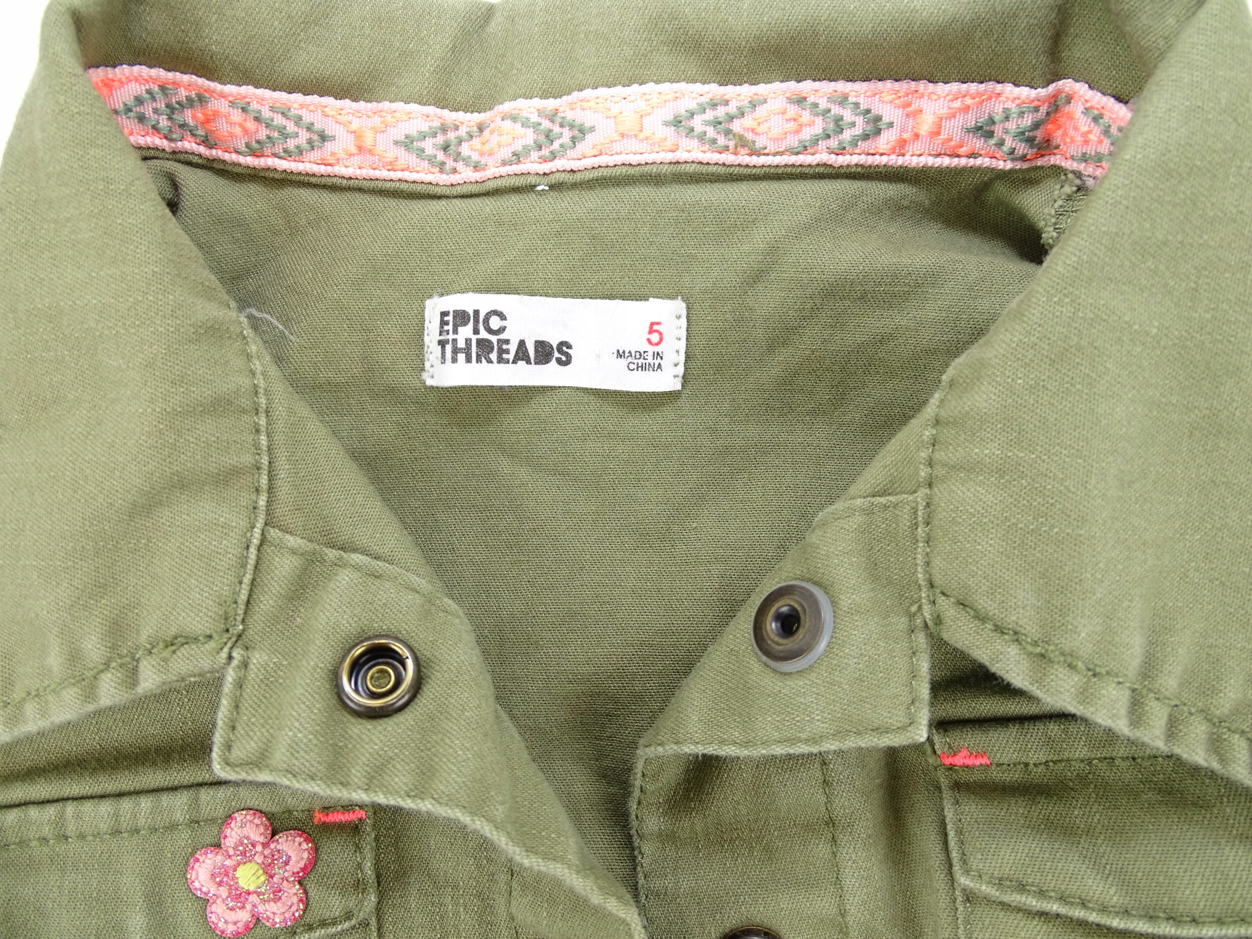 Джинсовая куртка цвета хаки с декоративными нашивками и рюшами по низу, застегивающаяся на кнопки EPIC THREADS. Размер на этикетке США, возраст 5 лет, ориентировочный рост 110 см. Внимательно проверяйте размеры, размеры могут отличаться от европейских.