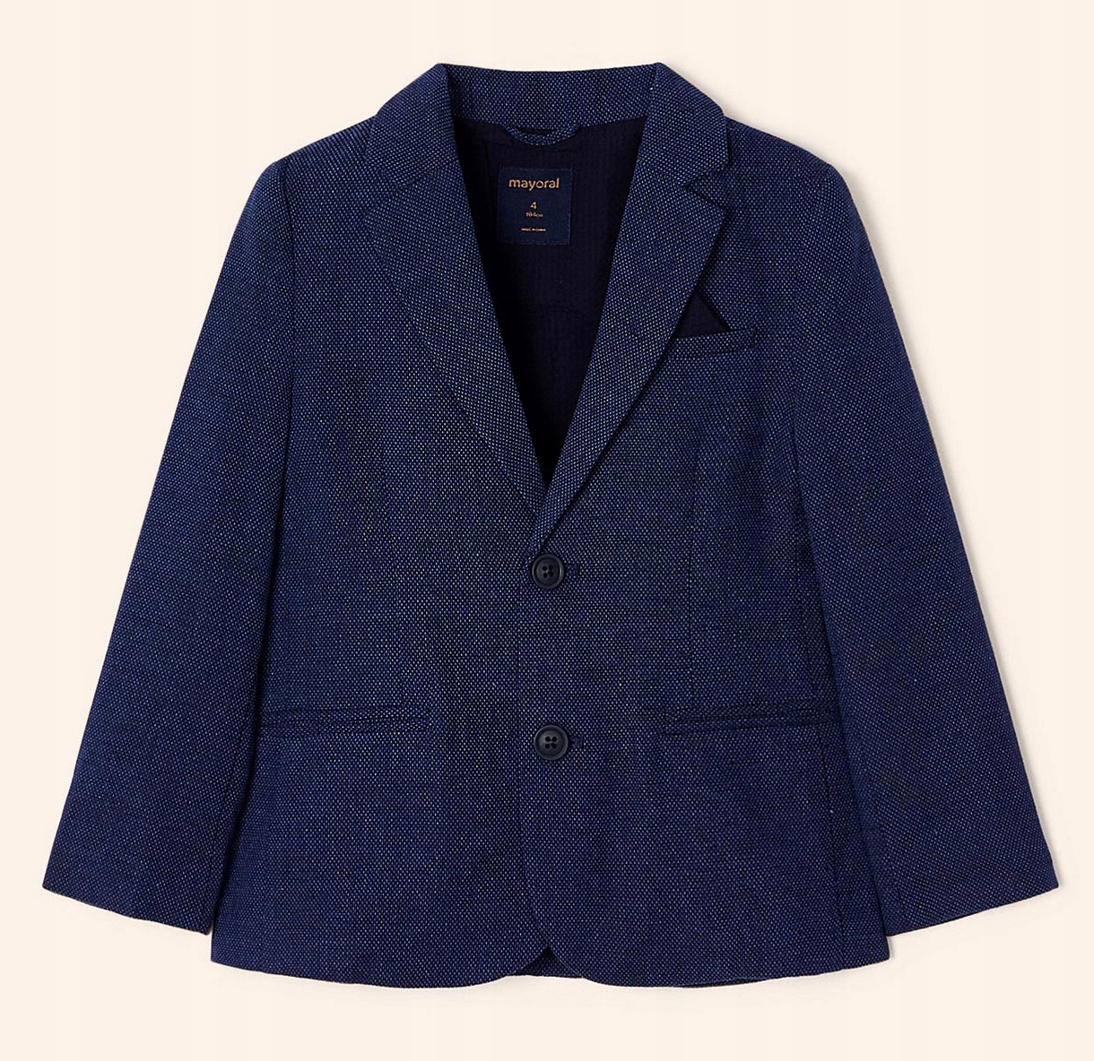 Куртка с длинными рукавами для мальчика. Манжеты на пуговицах. Воротник с лацканами. Застежка на пуговицы спереди. Ткань со структурой, имитирующей лен, мелкими «кубиками». Функциональные карманы спереди.