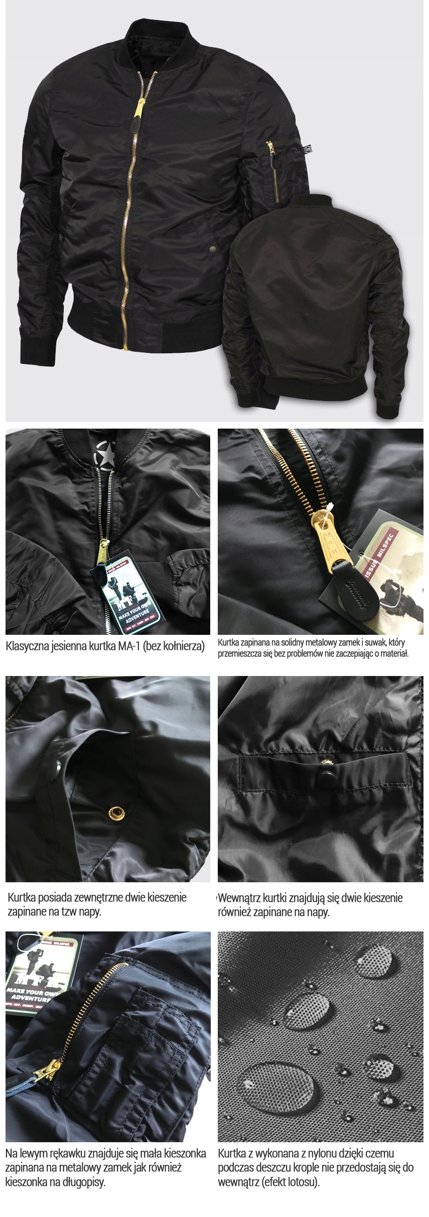 Куртка-бомбер МА1 с легким утеплителем, идеально подходит для весны и осени. MA1 имеет прочные манжеты на рукавах и талии. Куртка имеет два боковых кармана, застегивающихся на кнопки. Куртка-бомбер застегивается на прочную металлическую молнию. На левом рукаве есть небольшой карман на молнии, в котором также есть карманы для ручек. Внутри куртки также есть небольшой карман на молнии, идеально подходящий для документов или телефона. Внешний слой изготовлен из водонепроницаемого нейлона, а внутренняя подкладка – из полиэстера. Идеальный тонкий бомбер, который идеален для дождливых осенних дней и холодного весеннего утра.