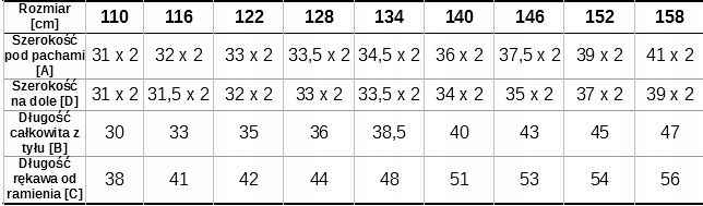 Таблица размеров (замеры сделаны в горизонтальном положении без растяжения, могут отличаться на +/- 1 см)