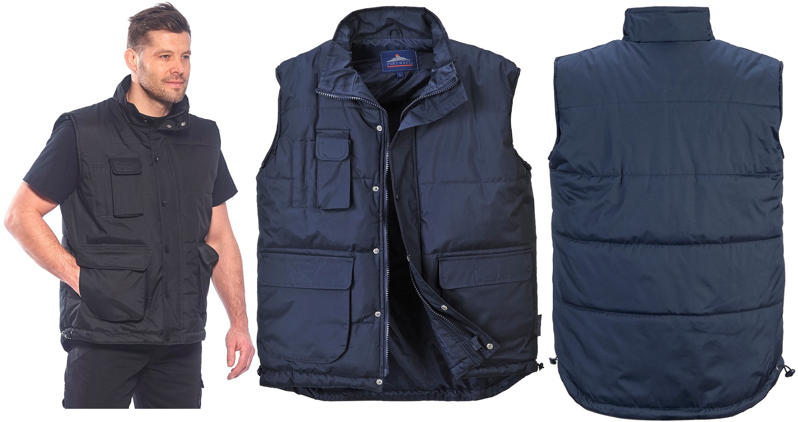 Безрукавка водонепроницаемая изготовлена из прочных материалов. Остается устойчивым к небольшим дождям. Имеет закрытые боковые карманы и карманы для телефона и ручек, а также очень практичный карман для согрева рук.