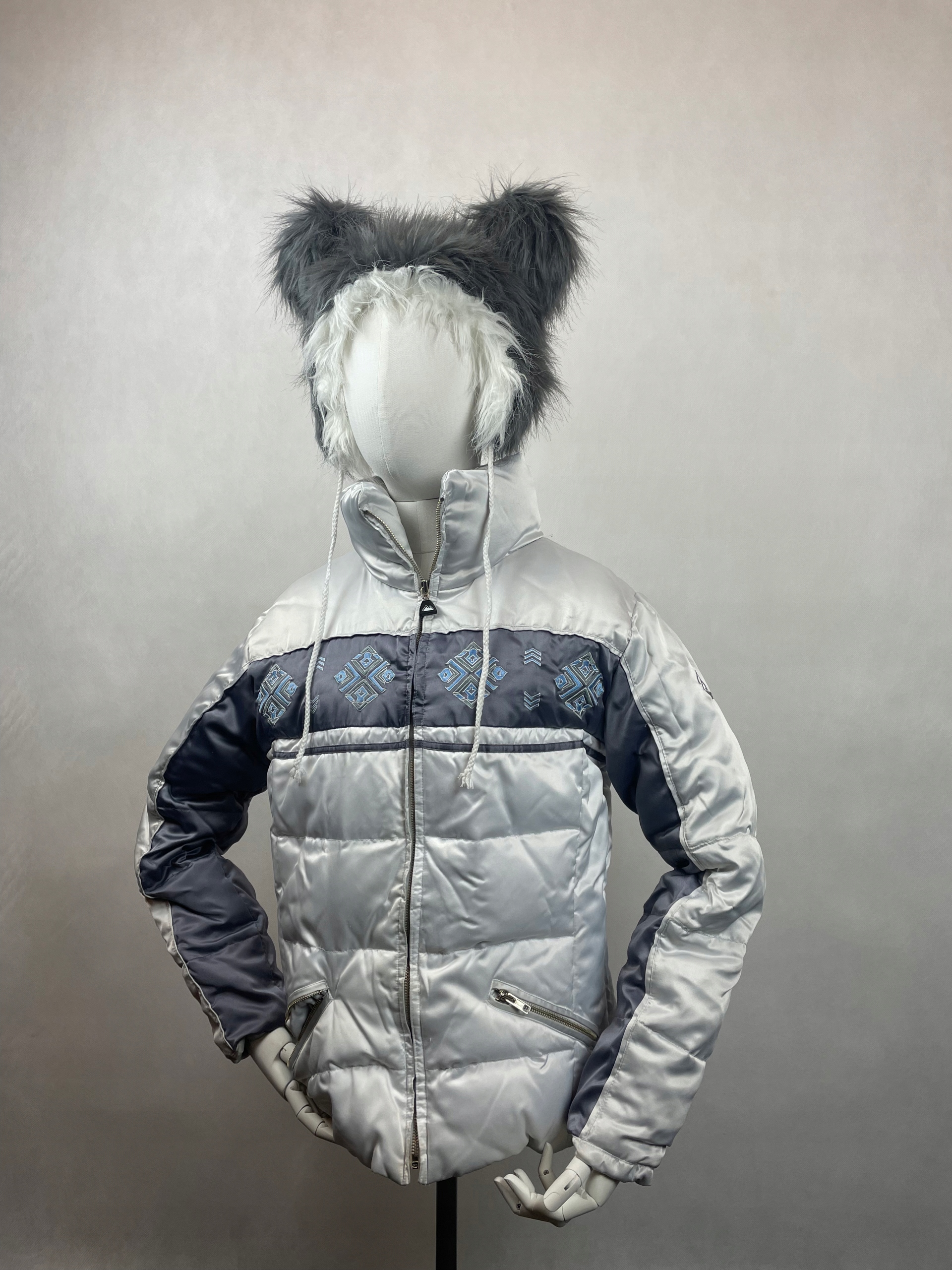 Белый пуховик с серыми вставками. Стеганый, застегивается на молнию. Имеет высокий воротник-стойку, защищающий шею от холода. Спереди имеется два кармана на молнии. Куртка очень теплая. Его наполнитель состоит из 58% утиного пуха, 10% пуха и перьев, 27% перьев водоплавающих птиц и 5% других наполнителей. На левом рукаве вышит логотип компании. Куртка имеет нормальные следы использования (небольшие потертости, пятна, загрязнения).