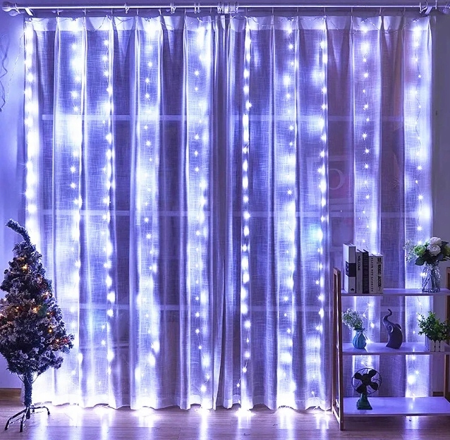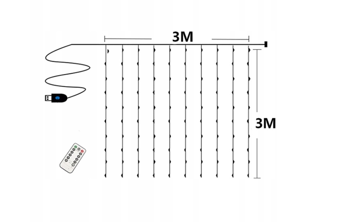 Kurtyna Świetlna Druciki Lampki 300LED 3X3m z Pilotem + Wtyczka + Haczyki