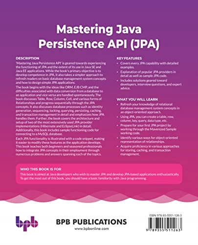 Книга начинается с таких идей, как ORM, EJB CMP, и трудности, связанные с преобразованием данных из базы данных в приложение, и наоборот, спонтанно. В книге обсуждается таблица, строку, столбцы, ячейку и различные формы отношений и прогресс в разделе по концепциям JPA. В нем также обсуждаются процессы базы данных, которые в качестве генерации идентификаций, секвенирования, блокировки, запросов, упорства, кэширования и управления транзакциями подробно и подчеркивают, как JPA обрабатывает их. Кроме того, книга охватывает архитектуру и настройку двух наиболее широко используемых реализаций поставщика JPA (Hibernate и Eclipselink).