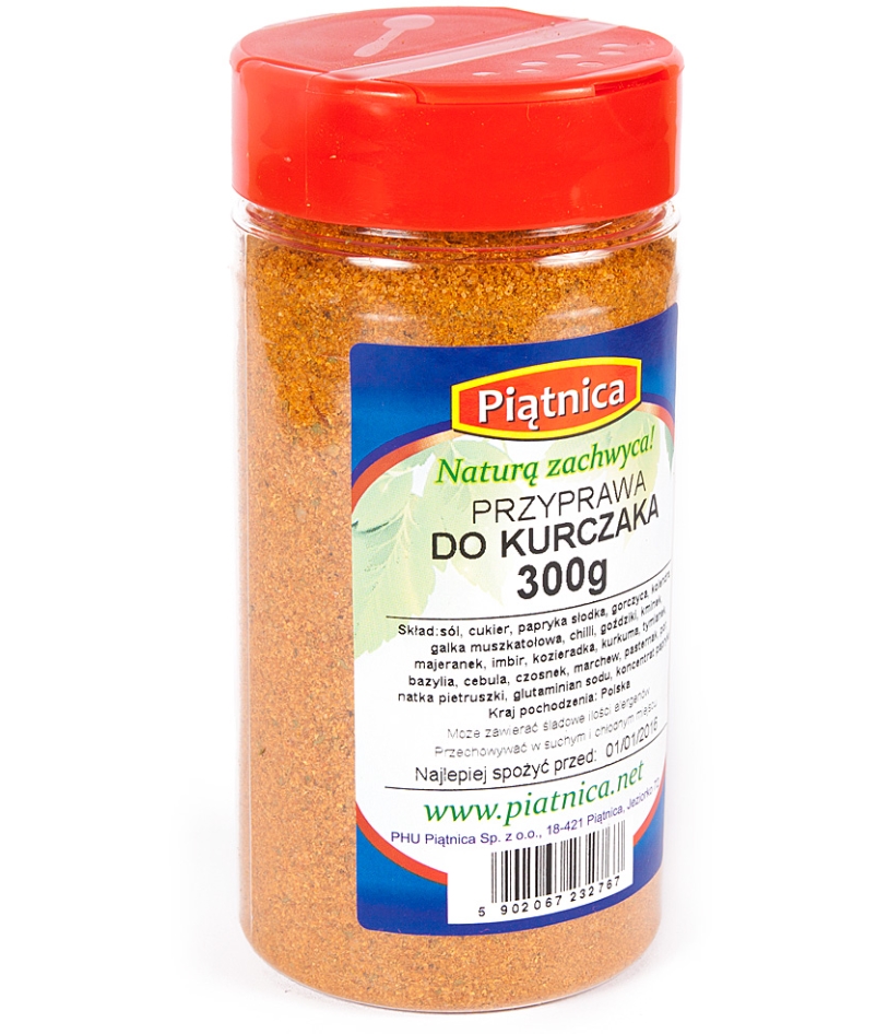 Цыпленка придает блюдам отличный вкус и аромат. Смесь состоит из очень разнообразных травяных и пряных специй - среди прочего: имбиря, куркумы, майорама, сладкого перца, чили, чеснока, кориандра, тмина, гвоздики и белой горчицы. Такая тщательно отобранная смесь гарантирует полный успех на кухне.