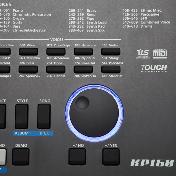 Модель КП150 помещена в привлекательный корпус синтезаторного типа и оснащена съемной пюпитром и встроенным в стереозвуковой системе с 4 динамиками.