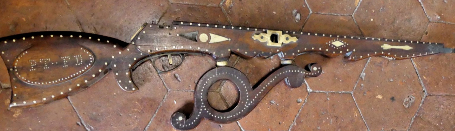 Старинная, роскошная ложа арбалета первой половины XIX-XVIII веков с множеством инкрустаций. Это качественная стреляющая модель; все вставки выполнены из кости, не хватает только одного элемента. Приклад изготовлен из дуба. Затворная рама и носовая часть отсутствуют. Красивый, качественный арбалет музейного уровня, идеально подходящий для ремонта и восстановления первоначального вида арбалета.