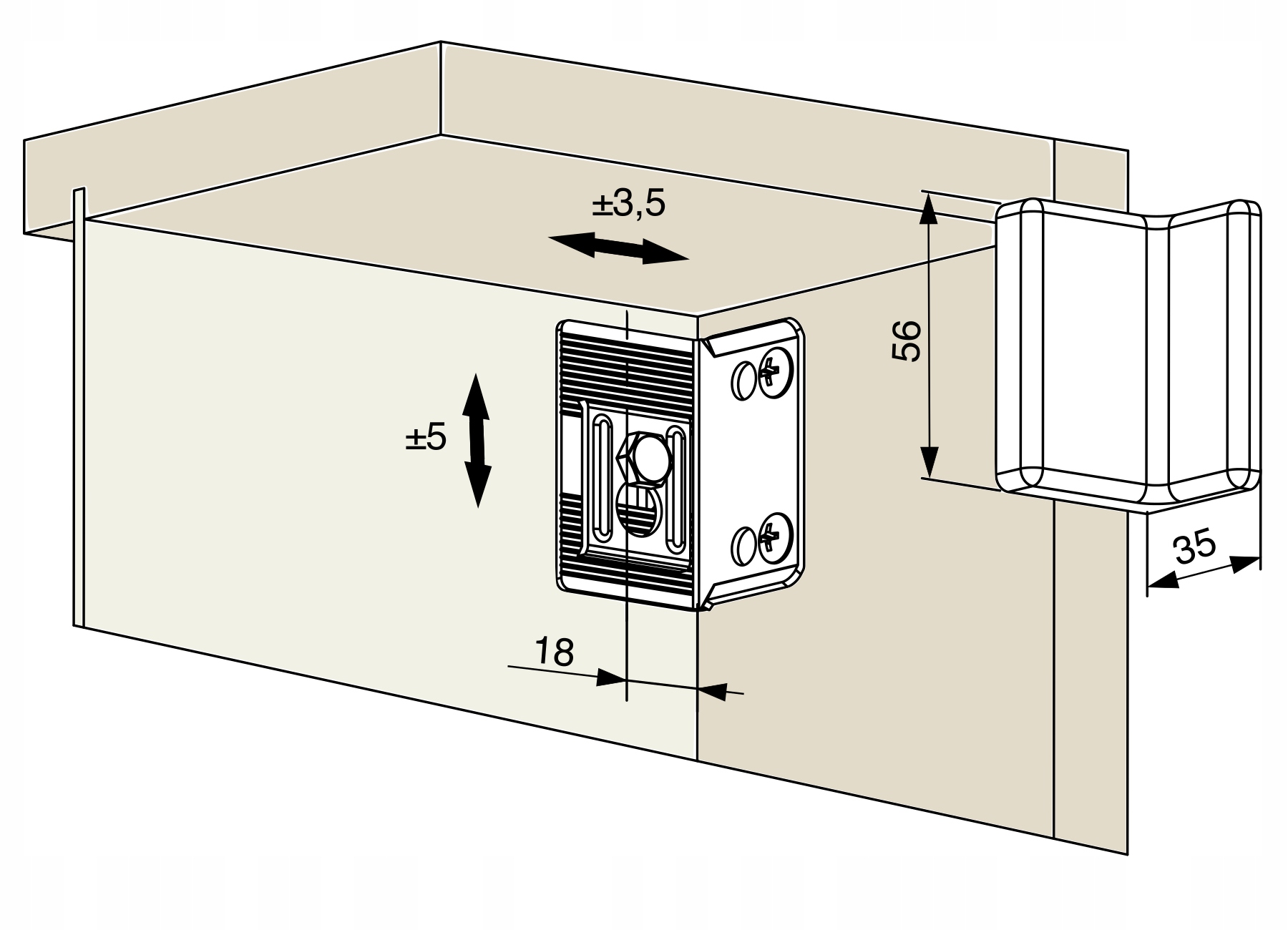 - Регулировка: вверх/вниз +/- 5 мм; влево/справа +/- 3,5 мм