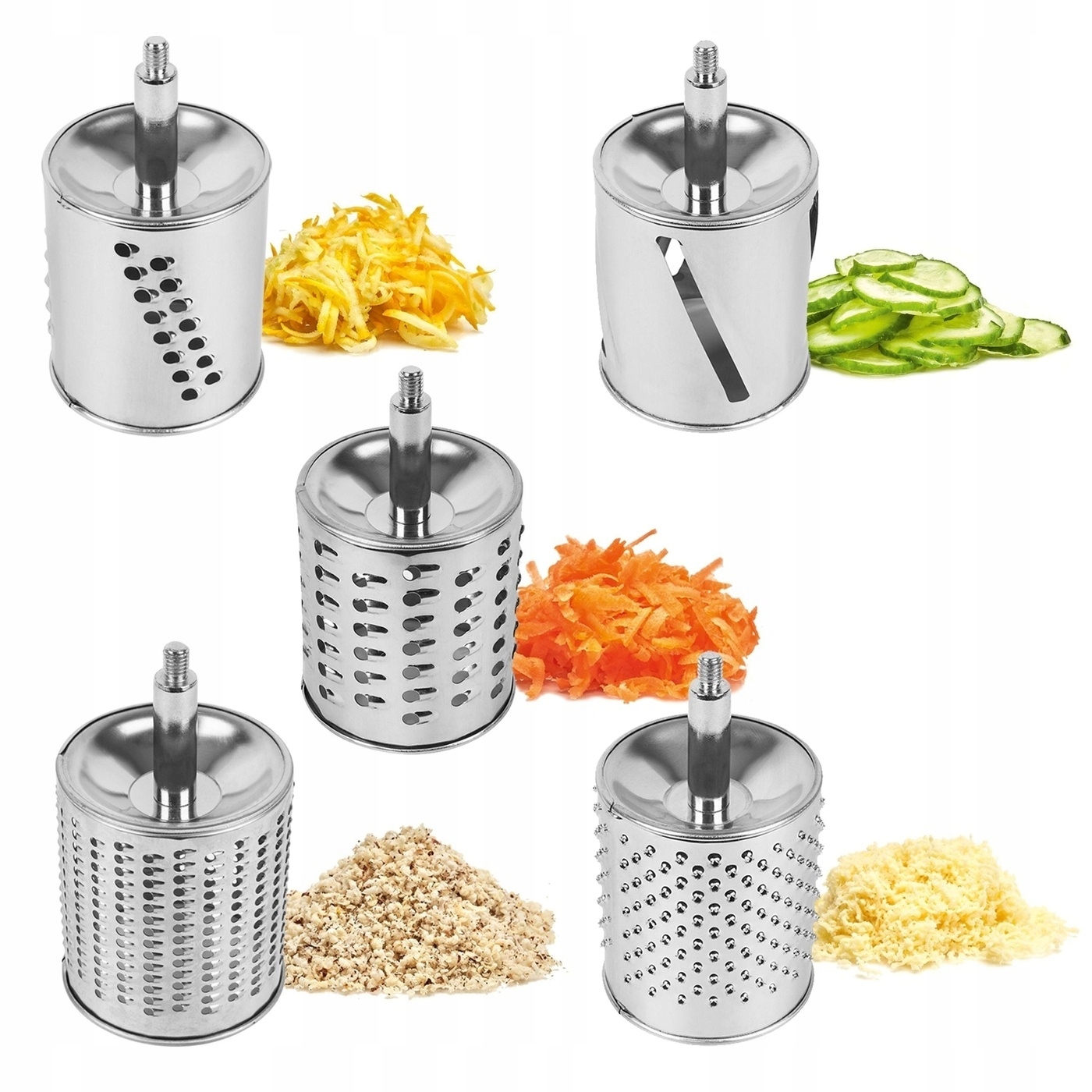 Элемент 3: 5 вставок, - вставка для крупной терки, - вставка для мелкой терки, - вставка для шинковки, - вставка для терки сухофруктов, шоколада, твердого сыра, - вставка для измельчения панировочных сухарей , картофельное пюре и очень твердый сыр, - диаметр: 7 см