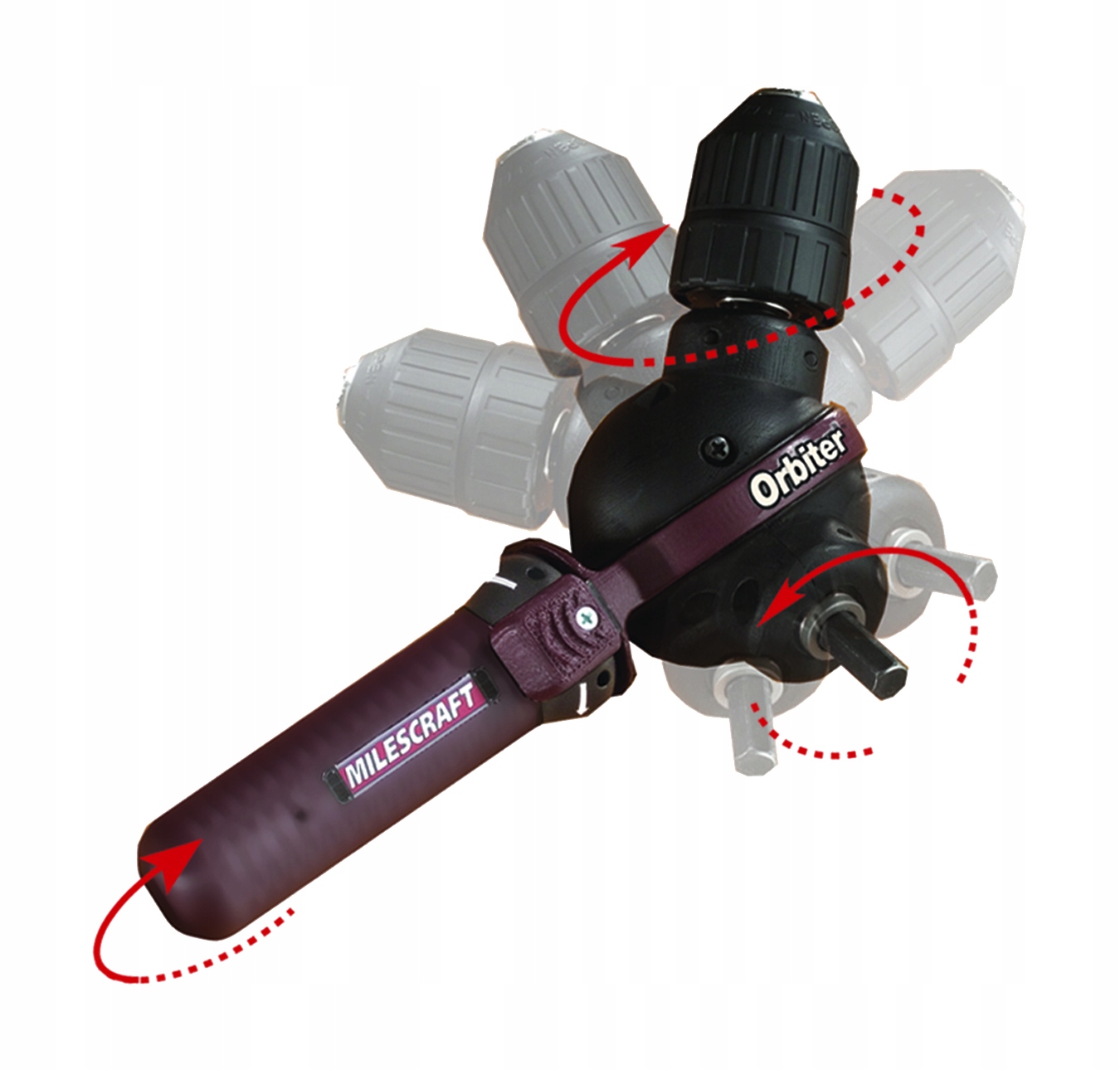 Инновационная вращающаяся насадка Orbiter от Milescraft для аккумуляторных и сетевых дрелей. Он позволяет сверлить под любым углом благодаря современному дизайну, обеспечивающему поворот головки на 360°. Устройство оснащено «самоцентрирующимся» шпинделем, позволяющим быстро прикреплять инструменты с различными захватами.
