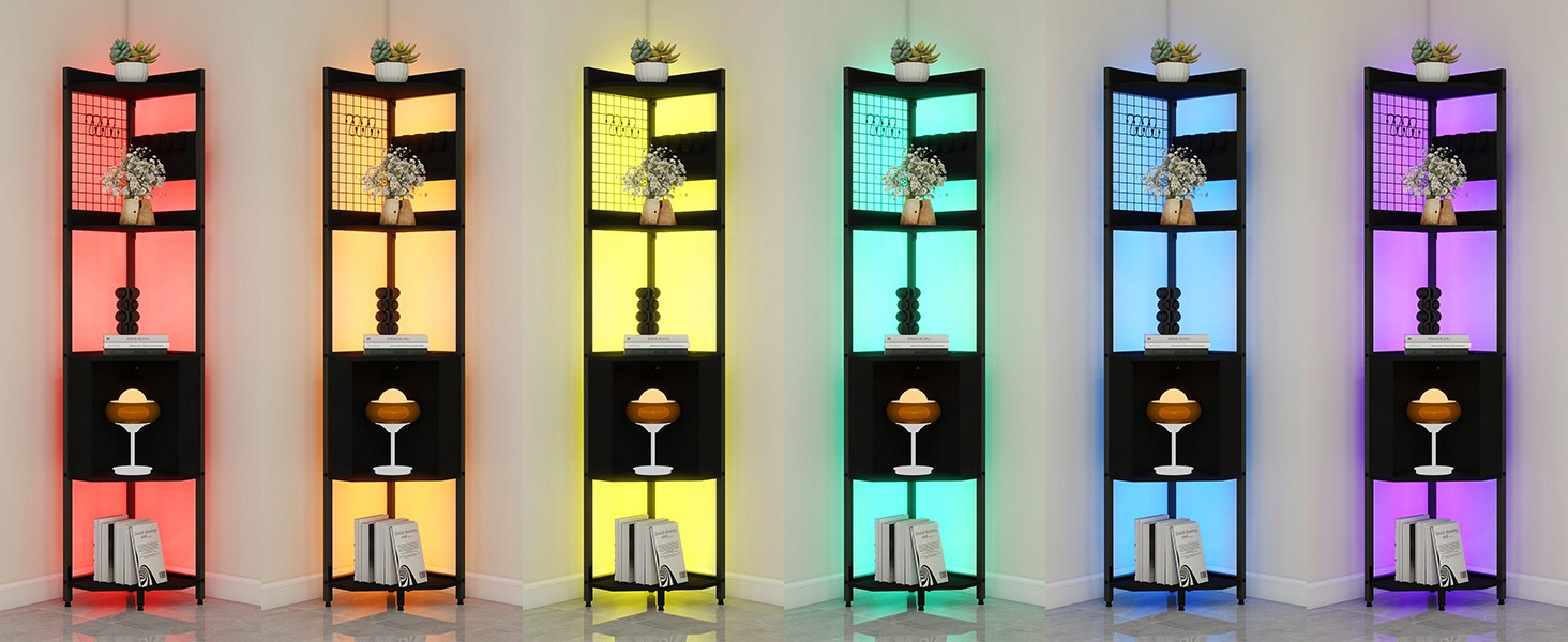 Elecwish 4-уровневая угловая полка со светодиодным светом, полка для организаторов, стоящих на высоте 160 см, черная узкая книжная полка с полкой для хранения на стене, до гостиной, спальни, металлической рамки, деревянная полка выставки