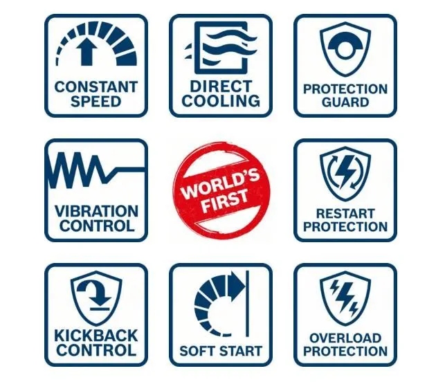 ⚙️Образцовый стандарт безопасности: блокировка KickBack Stop, защита от перезапуска, защита крышки от вращения во время работы и снижение вибрации уровни