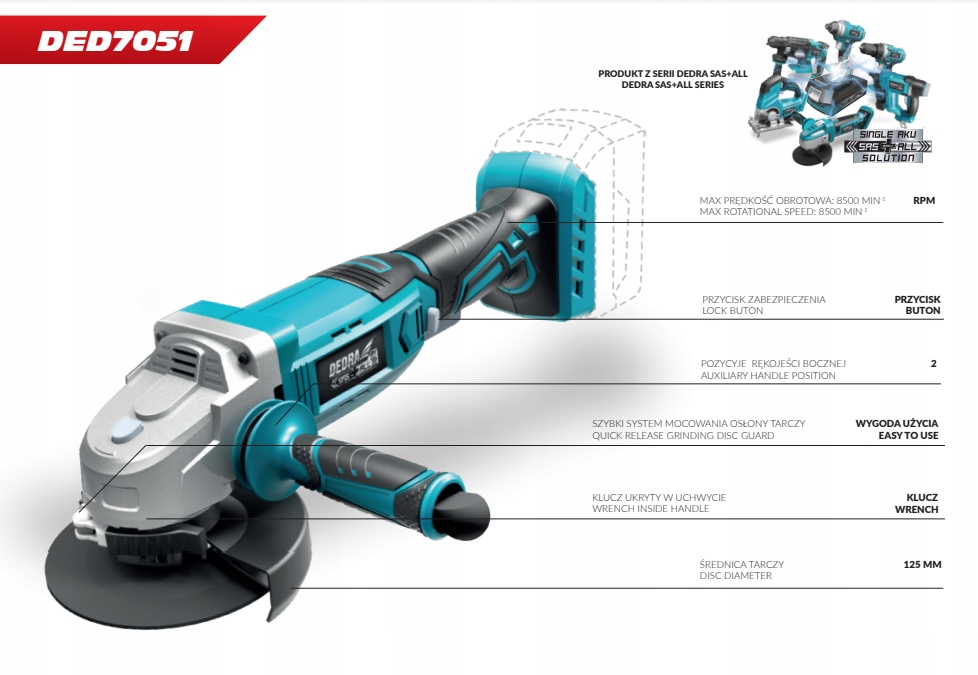 УГЛОВАЯ ШЛИФРОВОЧНАЯ МАШИНА Li-Ion 18 В DEDRA SAS+ DED7051