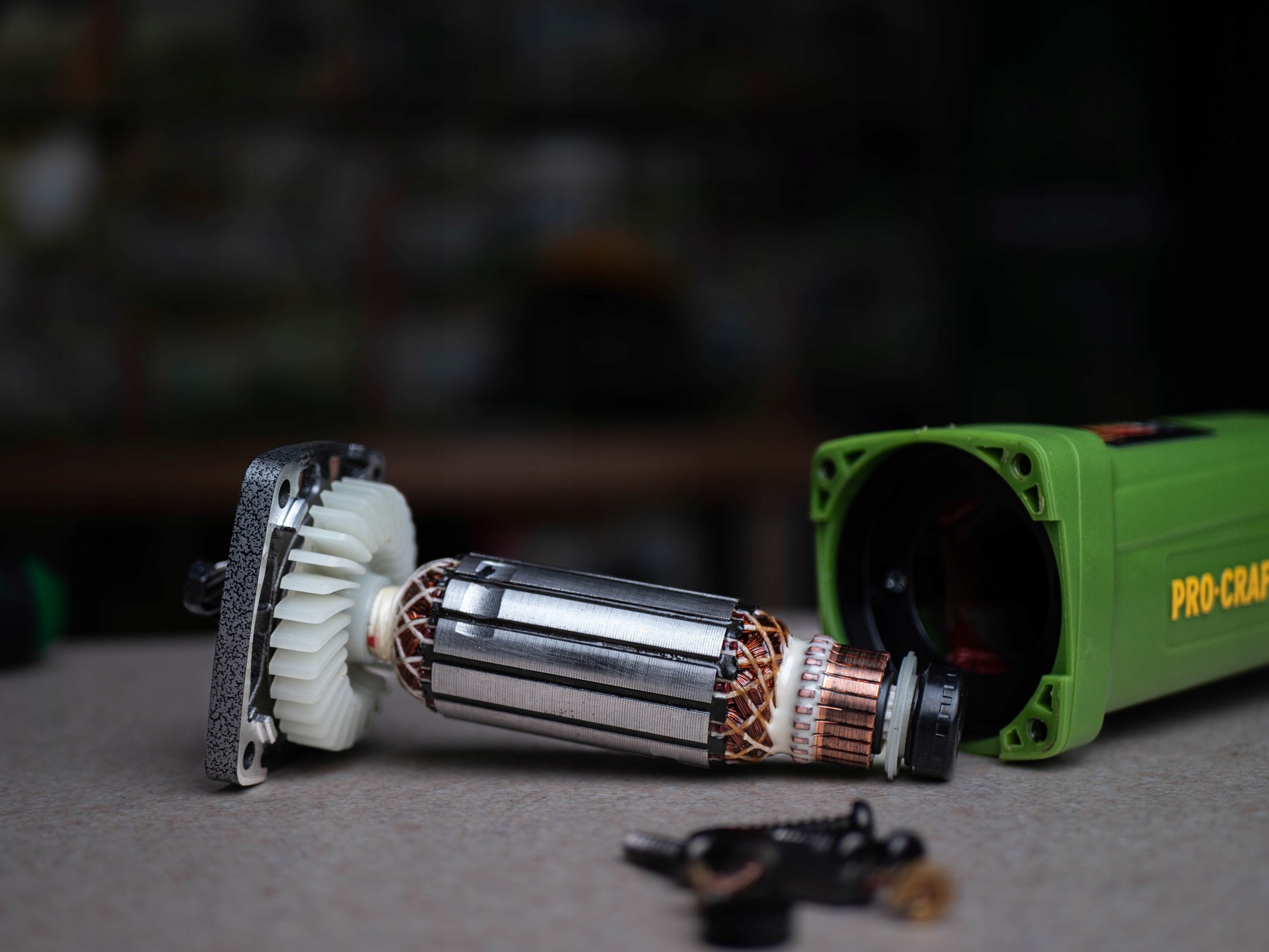 Сердцем любого электроинструмента является его двигатель, а модель PW1200ES оснащена одним из самых мощных двигателей в мире. Класс 125 мм. Используемый двигатель представляет собой прочную коллекторную конструкцию, состоящую из статора и ротора, обмотки которого изготовлены из высококачественной меди и намотаны на точно вырезанные пластины из кремнистой стали. Ротор закреплен в корпусе на специальном кольце, которое не только снижает вибрации, но и защищает корпус в случае повреждения подшипника. Дефлектор, установленный сразу за коллектором, предназначен для уменьшения количества частиц, которые вместе с всасываемым воздухом попадают между угольными щетками и коллектором.
