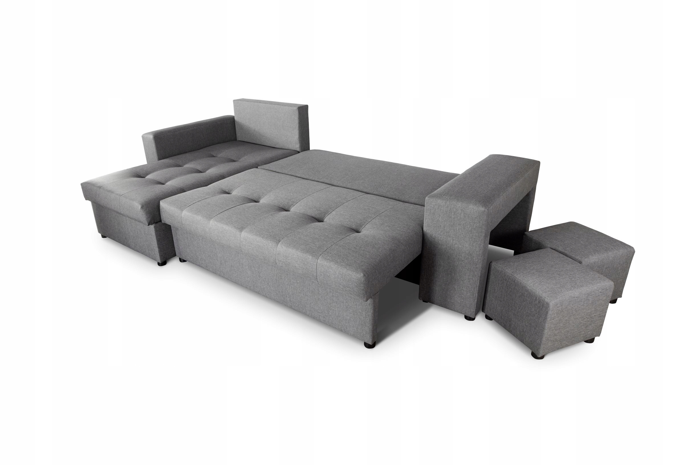 У этого предмета мебели есть один его боковые стороны специально разработаны для установки в него двух пуфов, и они не мешают нам, когда они нам не нужны, в цену входят два пуфа в цвет сиденья.